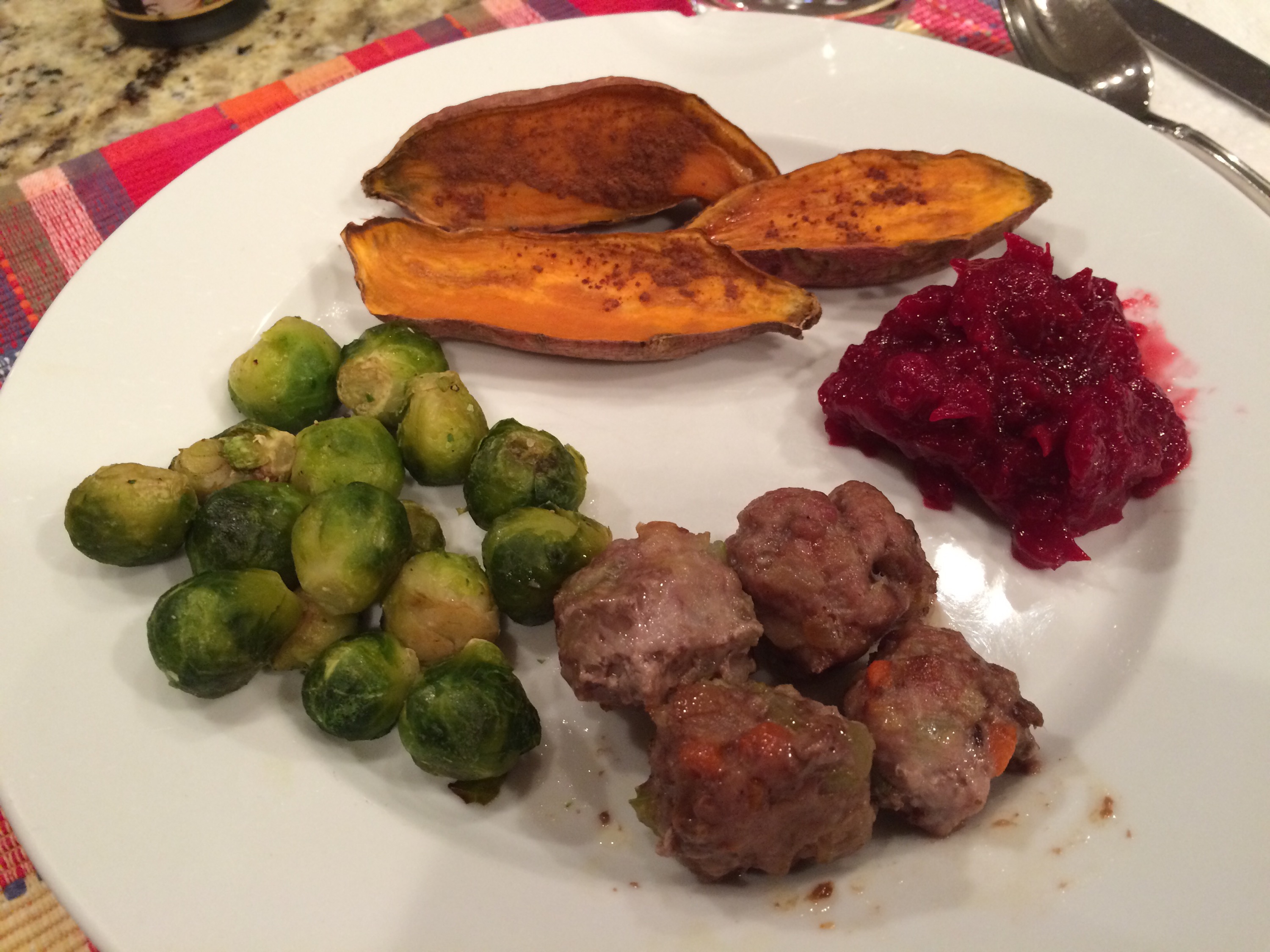 Unfortunately, it wasn’t quite as yummy as I though it would be. The cranberry sauce was very tart (recipe from the Paleo cookbook), the Brussels sprouts were somewhat bland and not the greatest texture (they’d been frozen) and the meatballs were just alright. Good thing sweet potatoes can be relied on to always be fantastic!