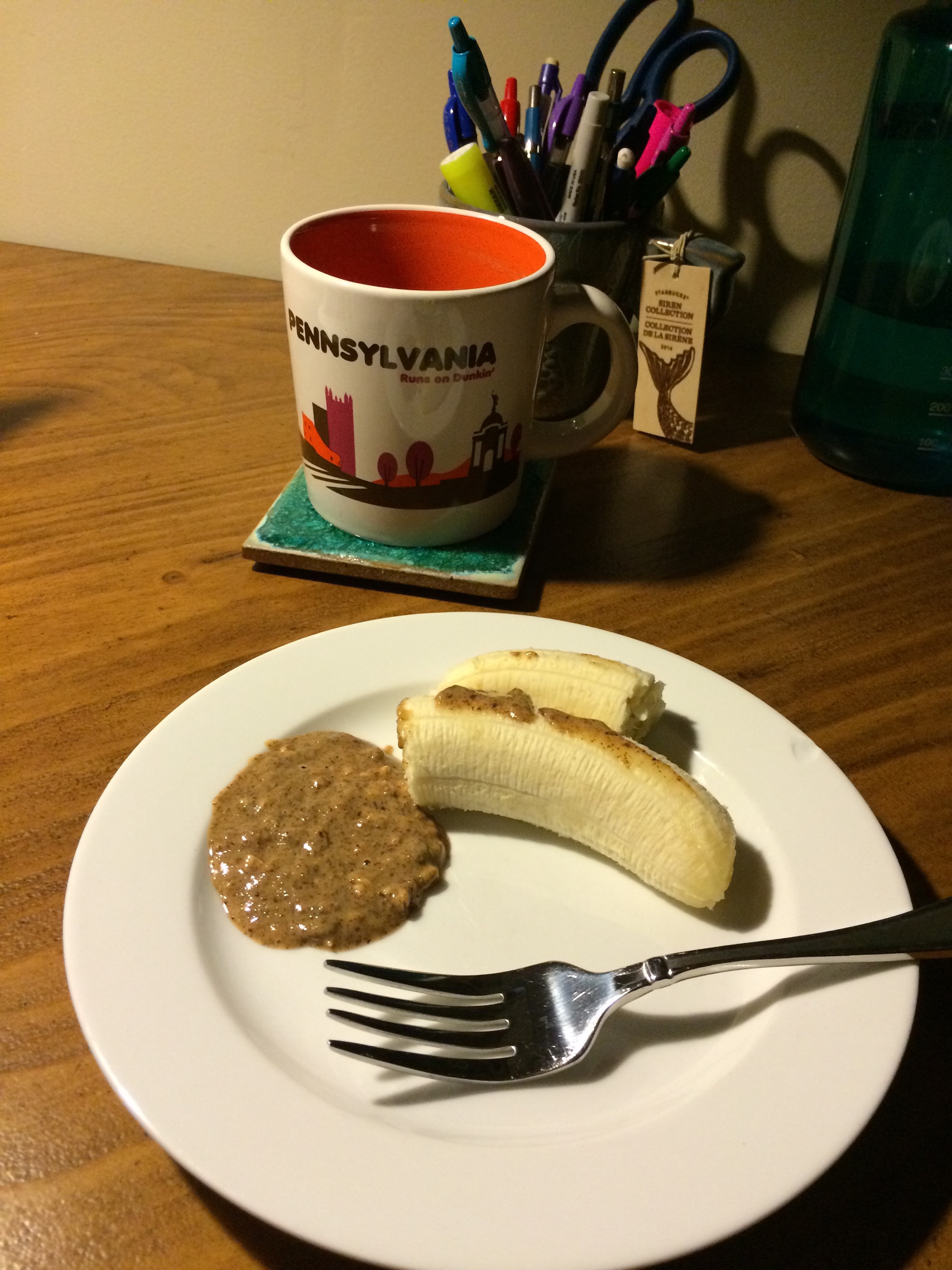 Early morning (around 5 a.m.): Earl Gray tea, banana and almond butter.