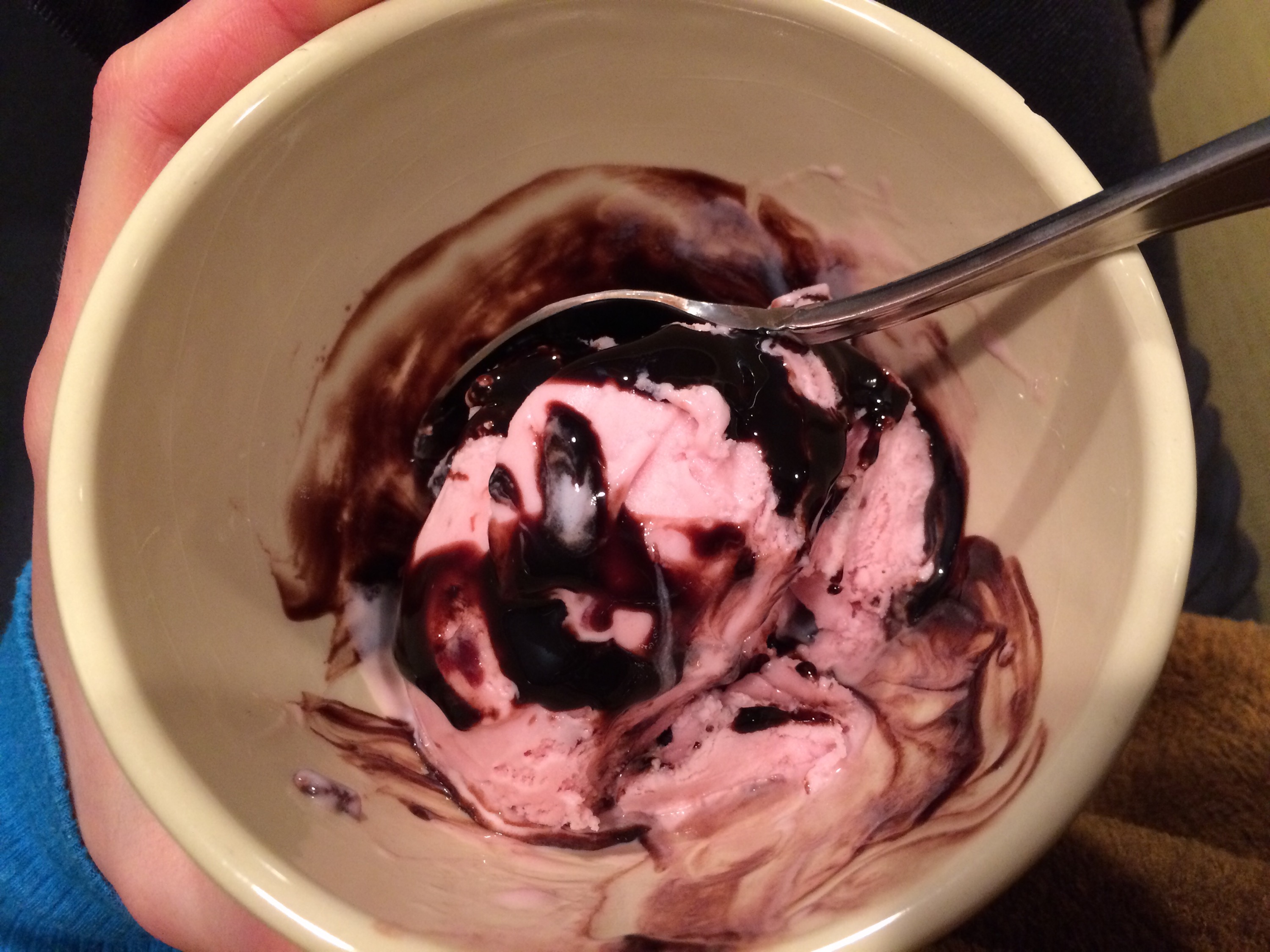 We spent the evening doing a variety of tasks, like relocating the Christmas decorations in the basement, folding clothes, painting a baseboard in the kitchen, and of course, cleaning up from dinner. That grill pan makes such a mess of the stove! I also wiped down the appliances and vacuumed the kitchen, all in the name of getting ready to go back to school. When I was finally finished, all I wanted was something cold and sweet: black cherry froyo with some dark chocolate syrup.