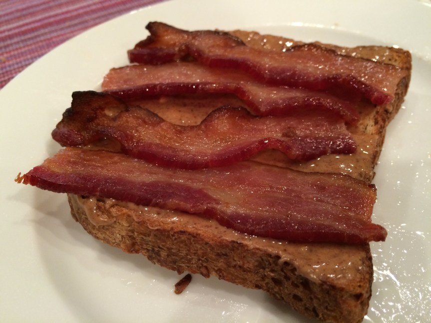 Bacon on Ezekiel bread with almond butter. In an effort to eat some bacon I cooked for Andrew’s weekday breakfasts, I channeled my inner chef to mimic the bacon and peanut butter burger I had at Cole’s, a bistro on Elmwood Avenue in Buffalo. Sounds crazy, but it’s good. And so was this. Thinking I might make one as a snack tomorrow…