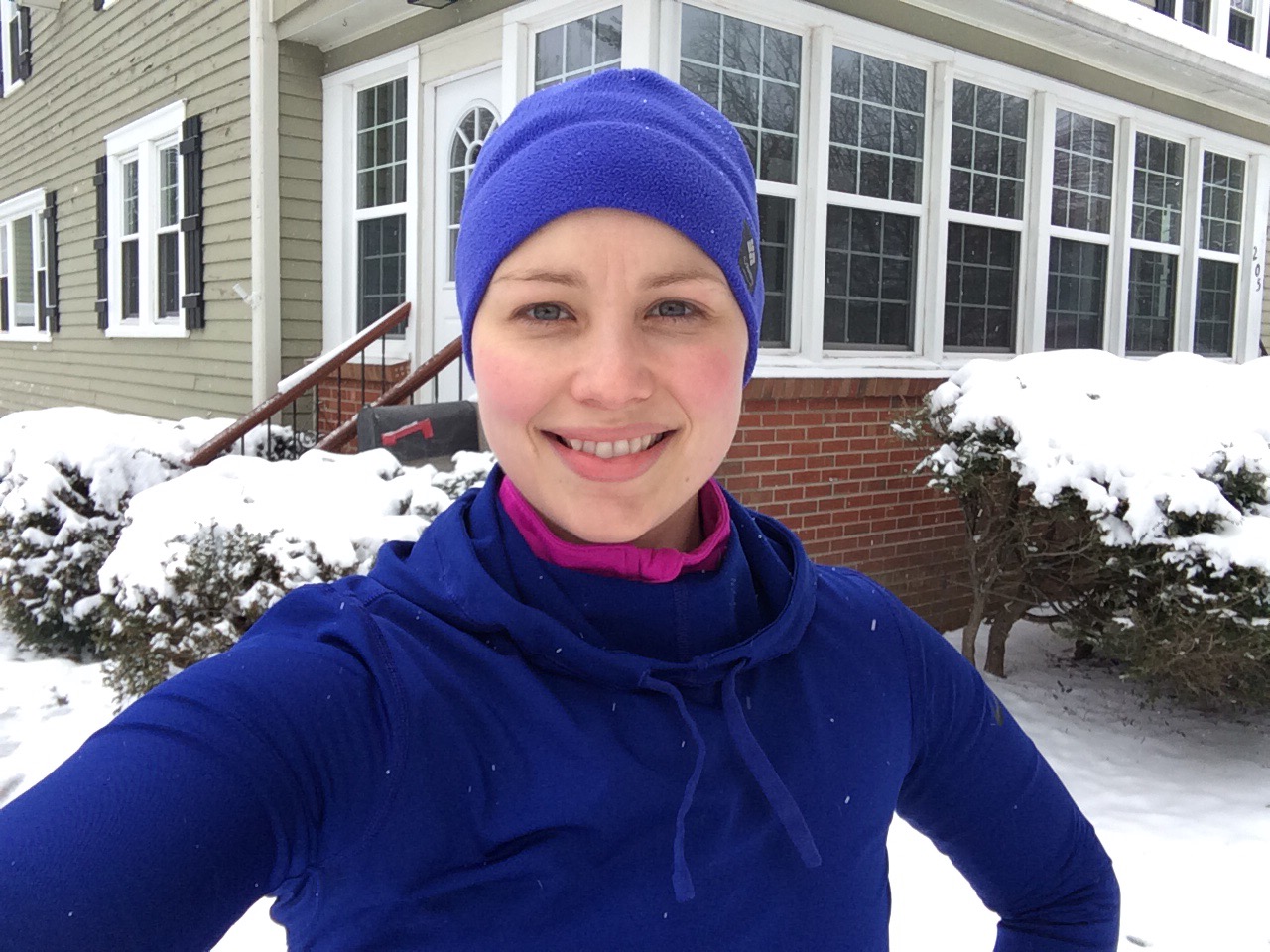 It was pretty brisk, but also a nice chance to get one more run out of all my cold-weather gear. In fact, this was the first time I tried out my new blue hooded running top (Nike). Scored it on sale from Dick’s awhile back and then the weather warmed up. (I knew it was too good to be true.) I loved having the hood up for the extra warmth.