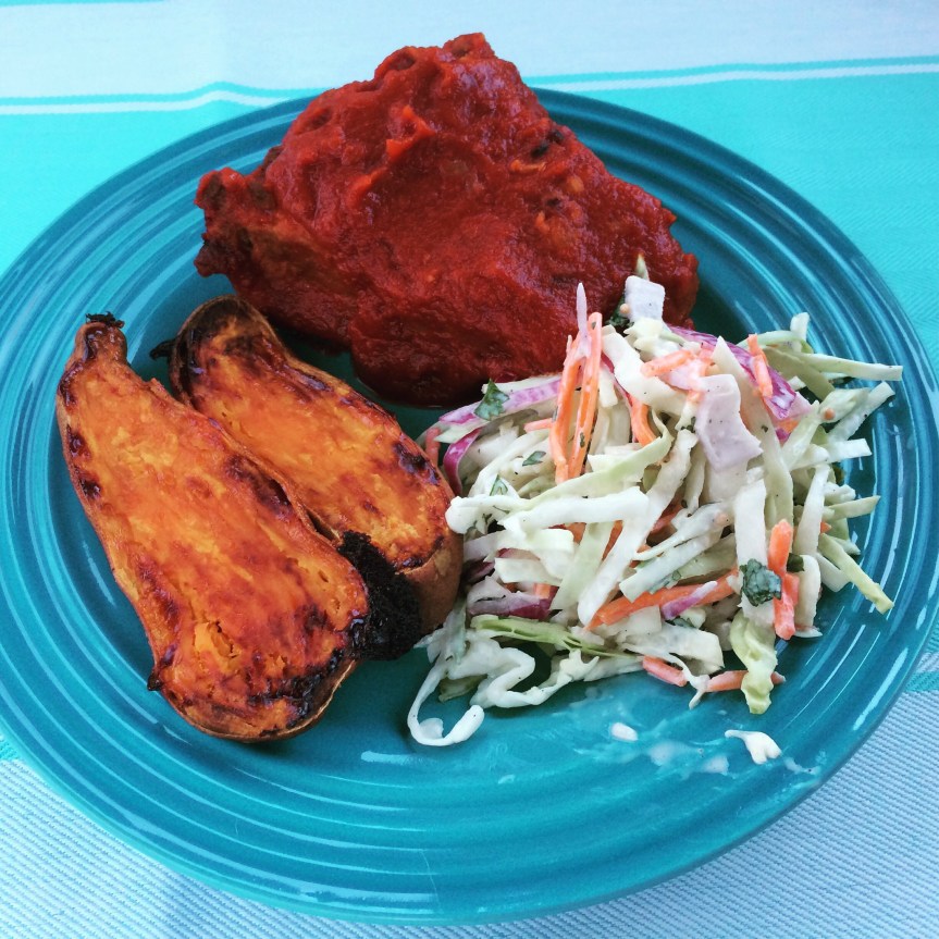 I completely messed up the ketchup I tried to make (grabbed the wrong measuring cup, wasn’t paying attention, accidentally poured in DOUBLE the amount of apple cider vinegar), so I salvaged it by adding more tomato paste and making a GIANT vat of barbecue sauce. So, I thawed some chicken, baked it in a 9×13 with the sauce and called it a day. Served with homemade coleslaw and baked potato.