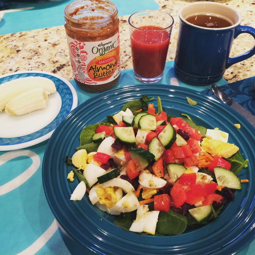 Saturday morning breakfast: a giant salad with hardboiled eggs, banana and almond butter, with V8 and tea.