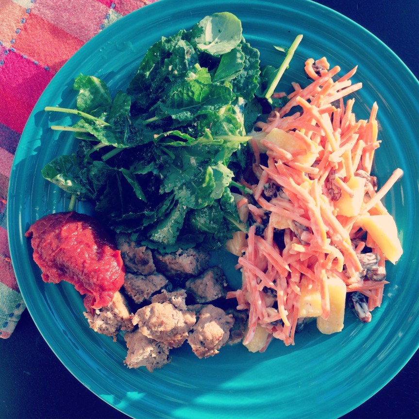 A breakfast: dressed kale greens, homemade carrot/raisin/pineapple salad and homemade sausage with bbq sauce.