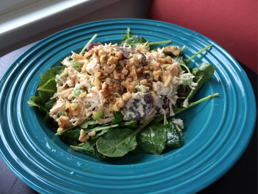 ‘Protein salad’ of canned chicken, homemade mayo, sliced grapes, celery and walnuts atop spinach and kale greens.