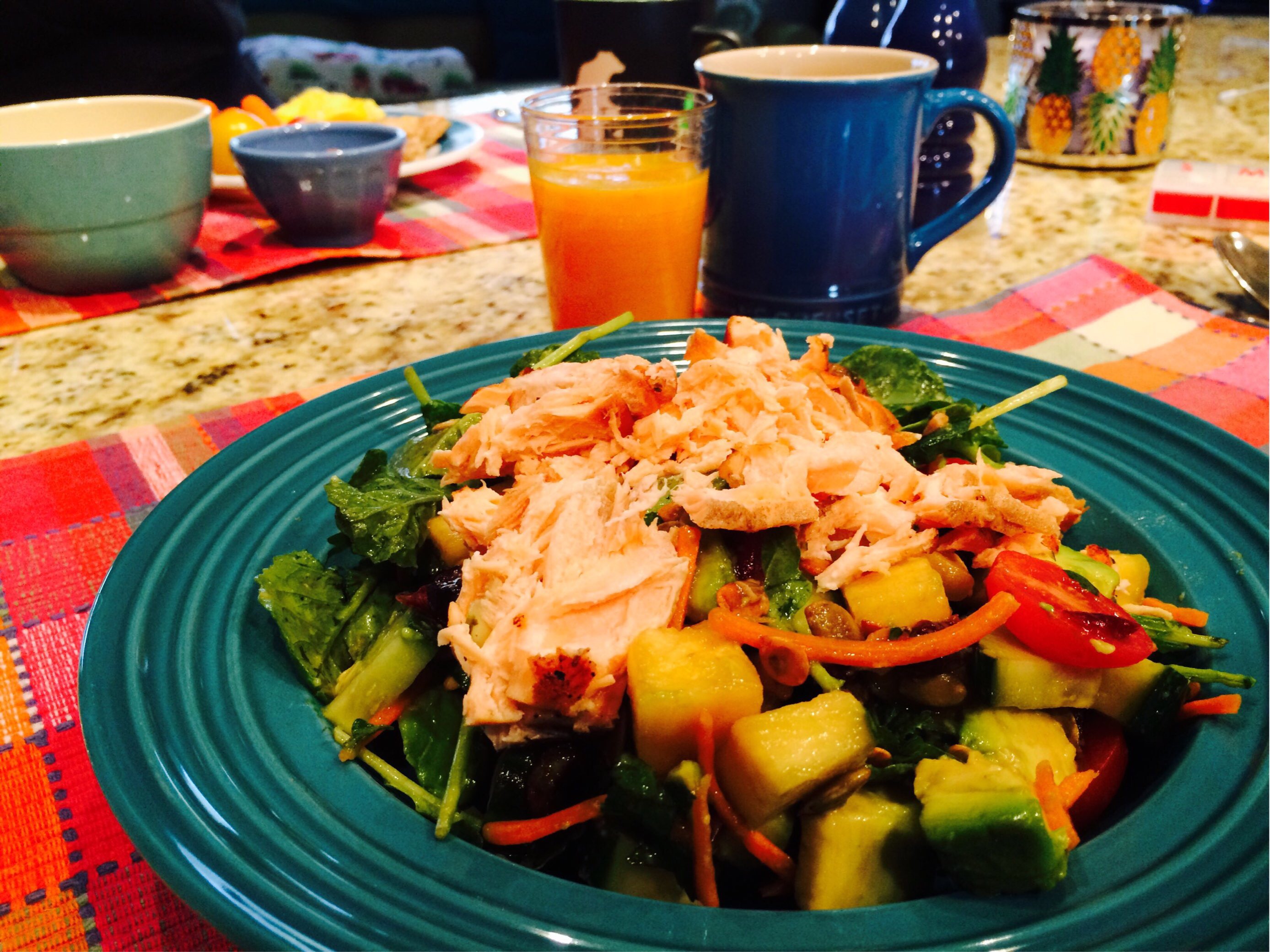 Sunday morning I loaded up on greens and veggies since we tend to go out to eat after church and I wasn’t sure what would be available. I topped my salad with leftover salmon from the night before.
