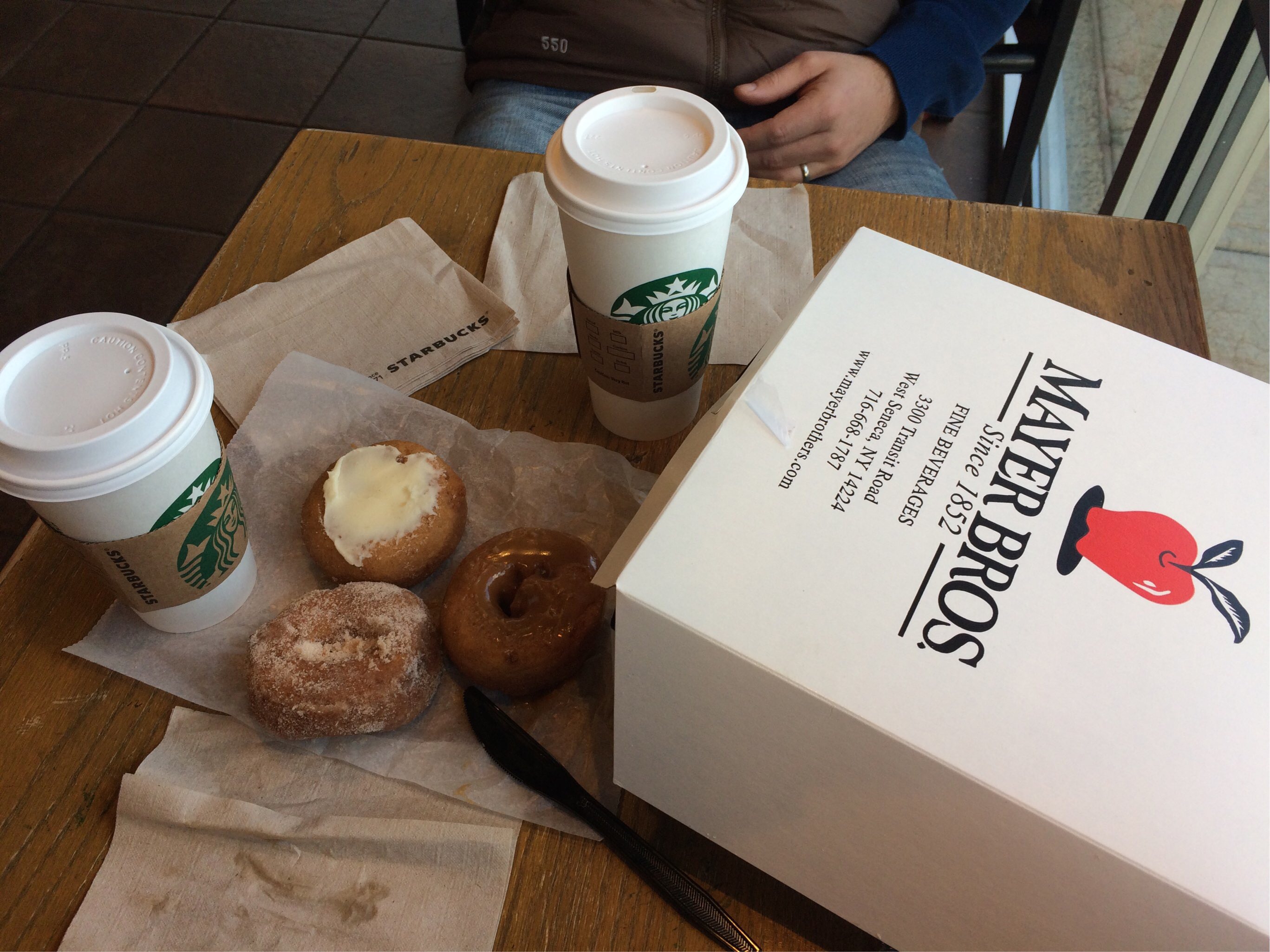 We grabbed a gallon of cider, a small jar of apple butter, a bag of cinnamon apple chips (a favorite of mine), an apple cider slushie (better than it sounds, I promise) and headed to a nearby Starbucks to enjoy our treats.  We got a mix of the traditional cinnamon-sugar-dusted and a couple for me to try (cream cheese frosted, caramel frosted), and I think a whopping SIX may have been consumed in total.  (I may not have felt guilty about enjoying those delicious donuts, but I certainly didn’t feel great afterward, either.)