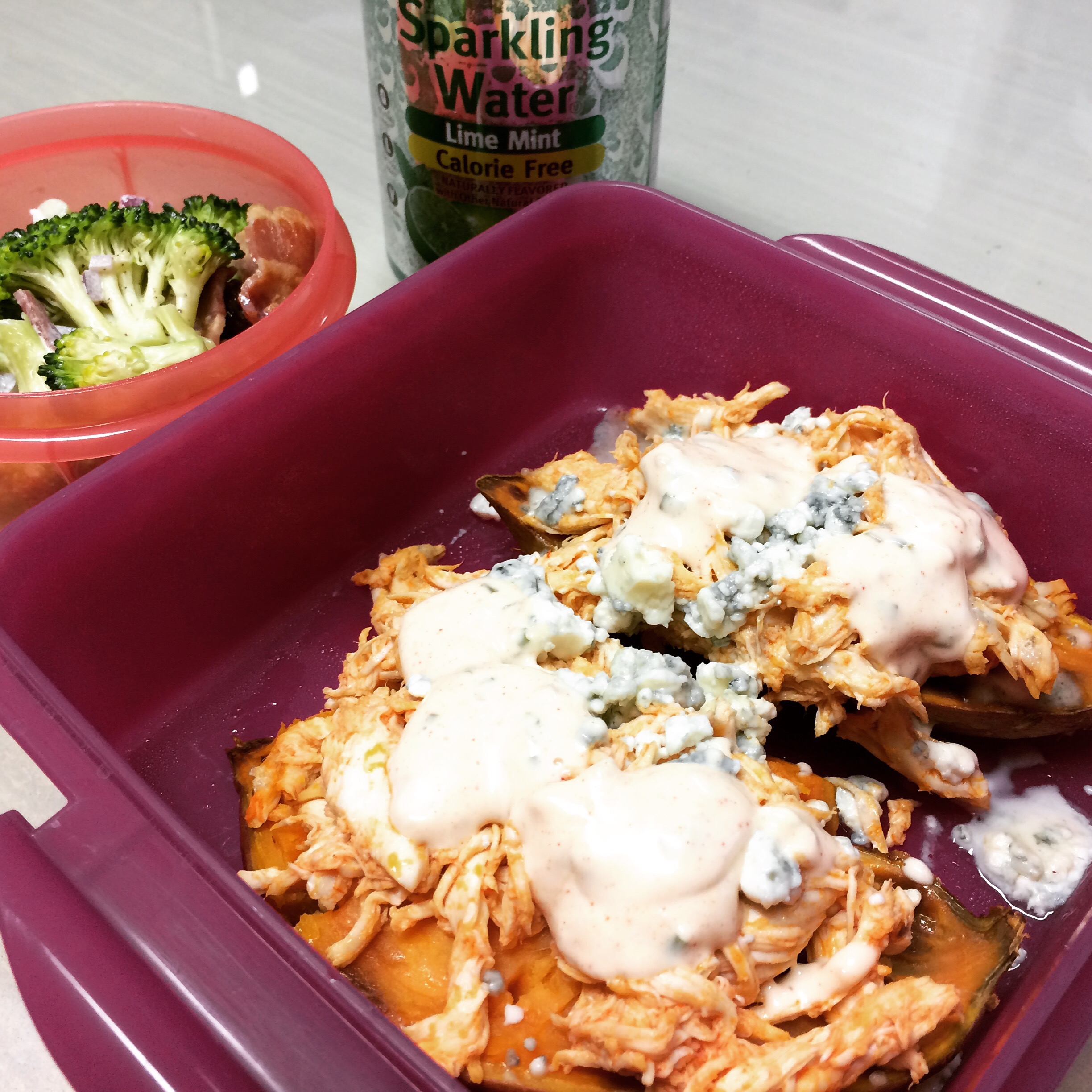 3. Place 2 sweet potato halves cut-side up in a container (or on a plate) and top with 1/4 of the buffalo chicken mixture.