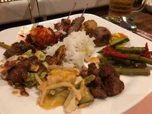 A rijsttafel is designed for two or more diners and includes a large bowl of white rice and multiple additional dishes, all with unique flavors. I counted about 5 or 6 meat dishes (beef, chicken and pork), 4 or 5 vegetable dishes, a plate of puffed rice ‘crackers’, three hardboiled eggs in a tomato sauce and three ‘dumplings’ of some sort.