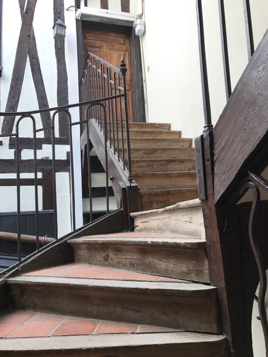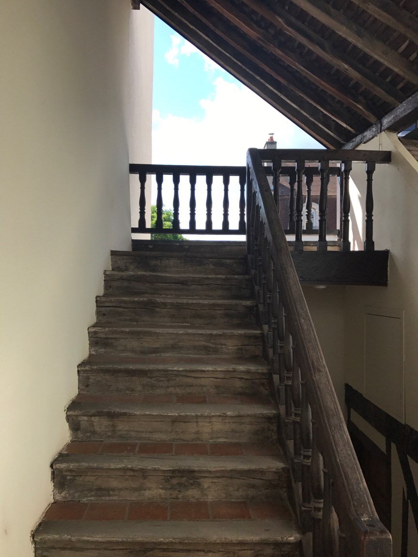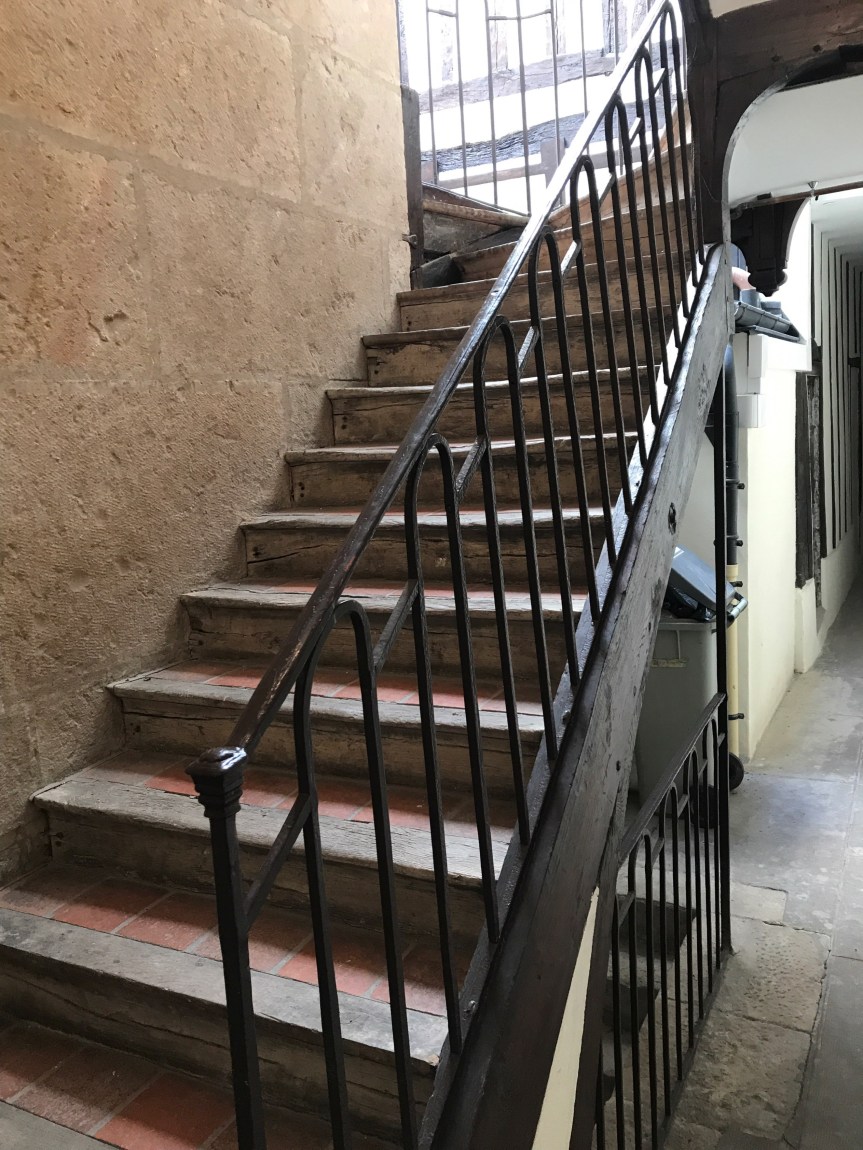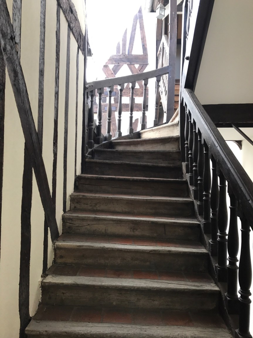 At the top of the spiral stairs in a small landing with local guidebooks and a city map drawn on a chalkboard wall. So bummed I didn’t get a photo of that!