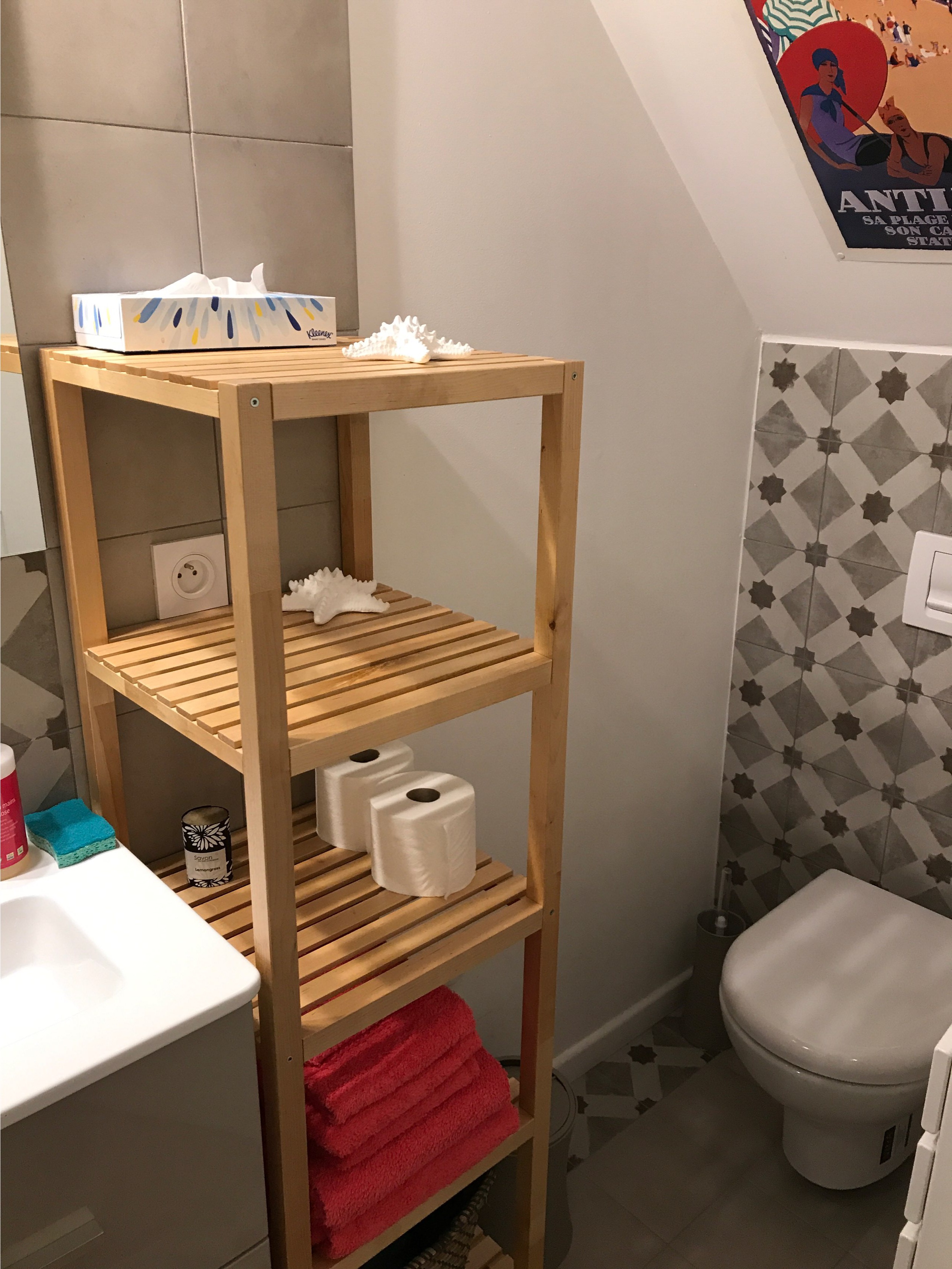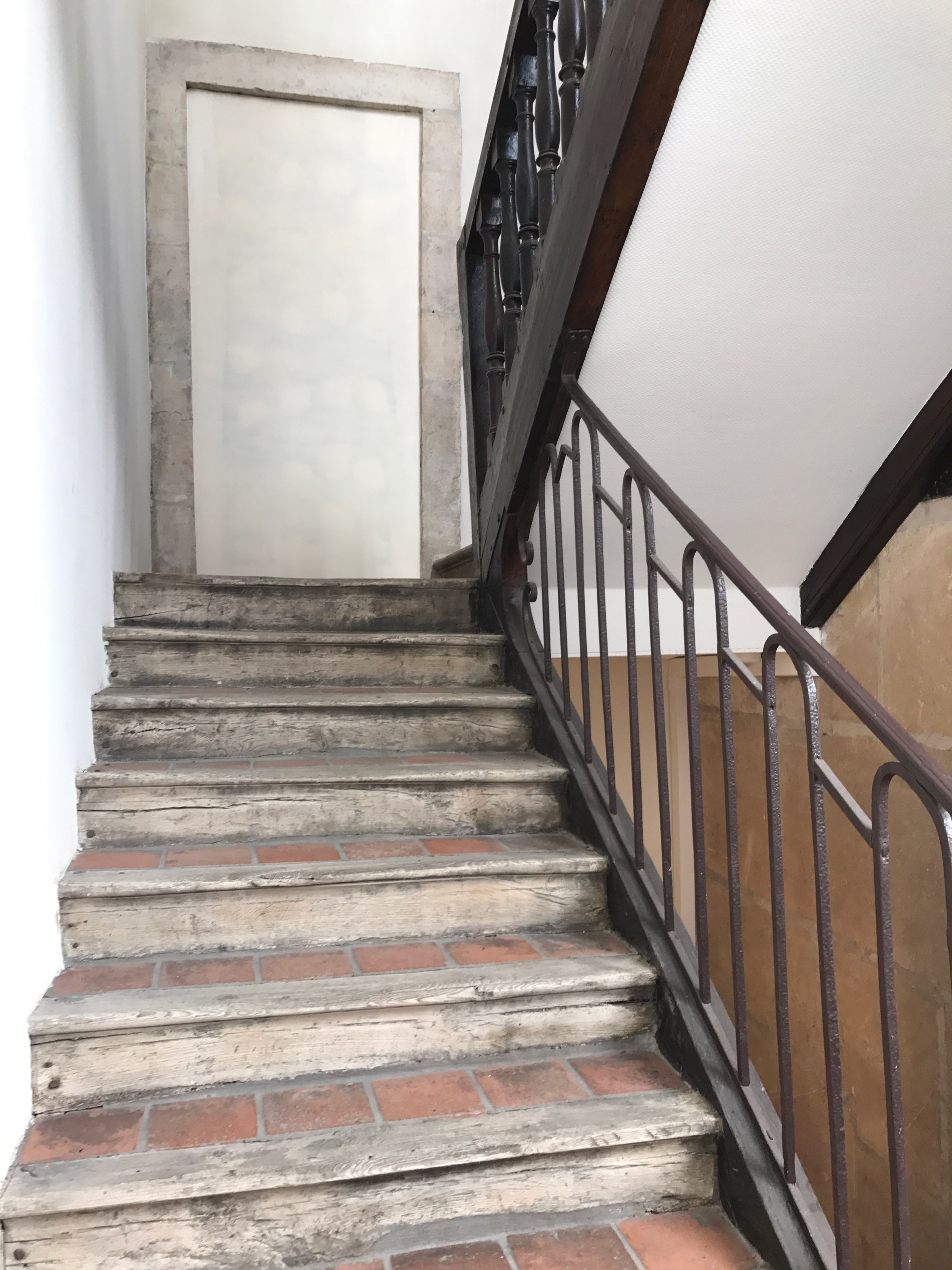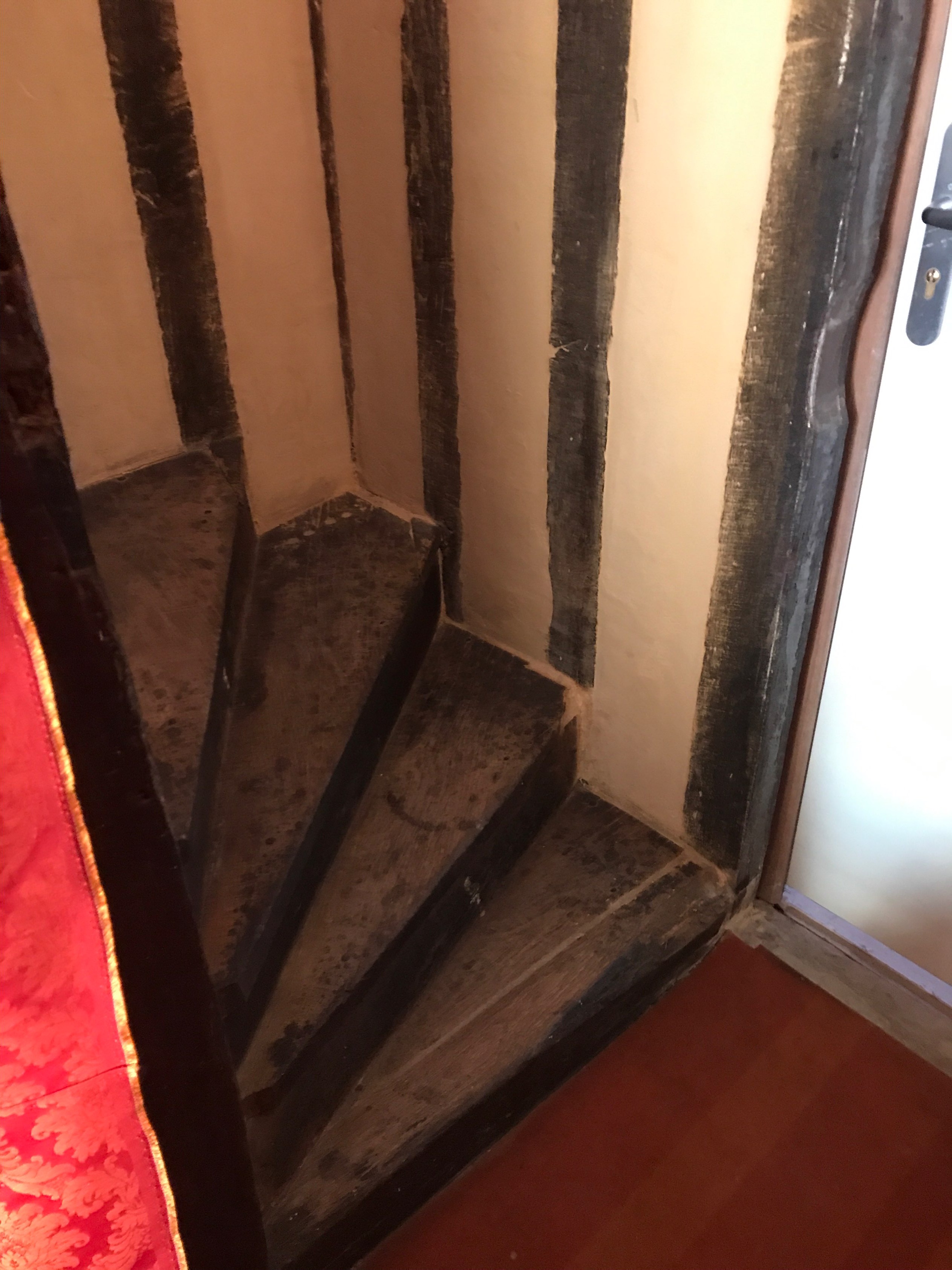 At the top of the spiral stairs in a small landing with local guidebooks and a city map drawn on a chalkboard wall. So bummed I didn’t get a photo of that!