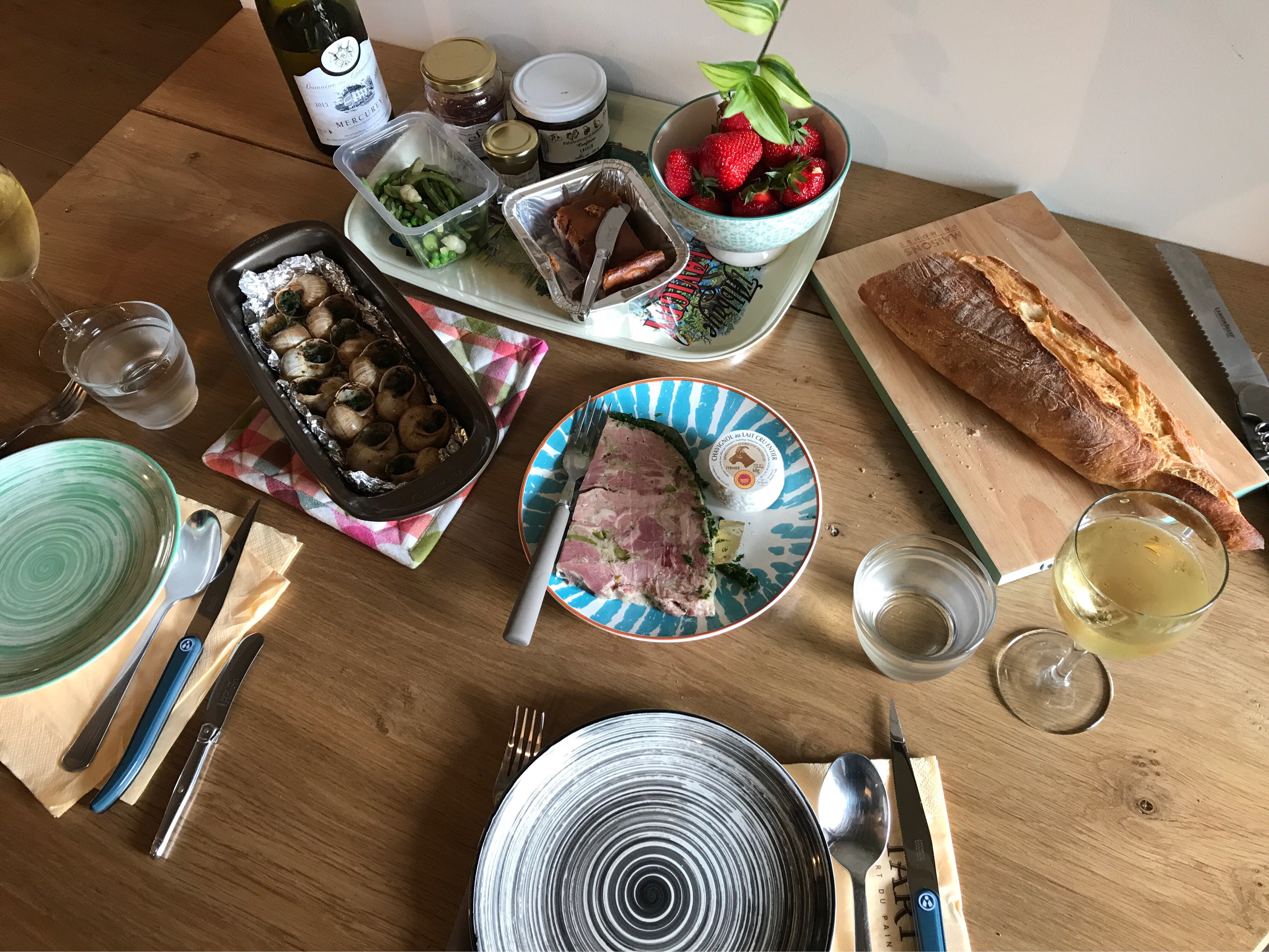 He really wanted escargot, so I got a tray of prepared snails (already stuffed with garlic butter), along with bread, cheese, strawberries, green beans, clafouti and a small slice of jellied ham with herbs.