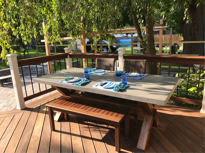 Anyway, we are finally ready to start enjoying the fruits of our labor, so we went ahead and spent a small fortune splurged on some quality outdoor furniture. (For what it’s worth, we’ve gone through almost 12 years of marriage with nothing but a tiny metal café table with two extra chairs for outdoor seating, which left no room for elbows, much less actual plates and cups.)