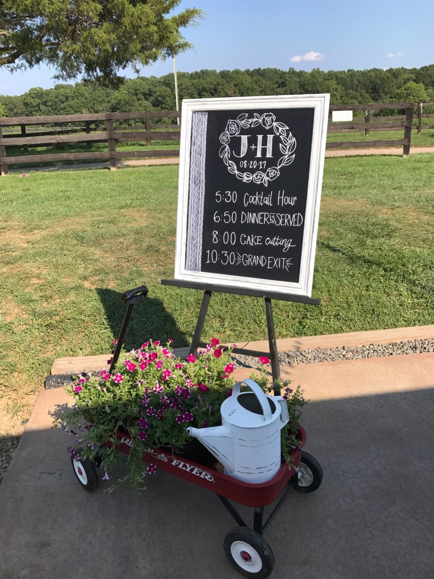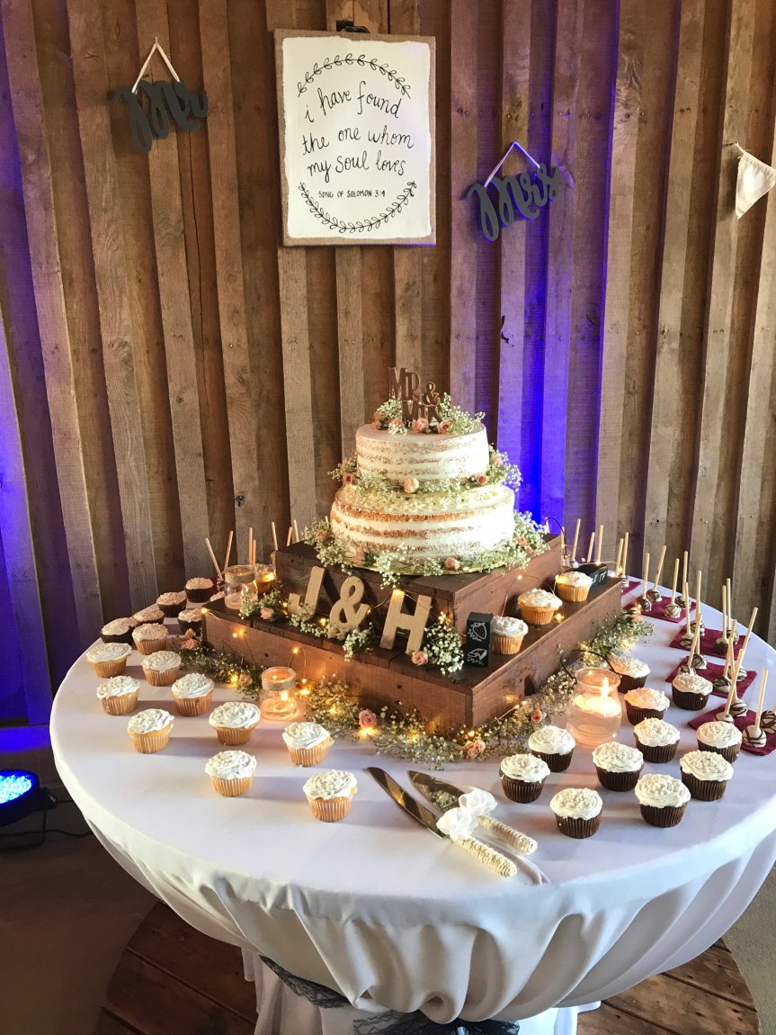 They got a cake from a local bakery and my mom made additional cake pops and cupcakes, too. Her best friend, Connie, decorated the cake and stand with baby’s breath and flowers just before the ceremony started. I painted the sign above the cake.