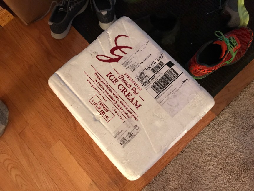 Andrew and I arrived on Thursday, one day before the Wilhelms, and we were excited to receive a special delivery in the mail that night: Graeter’s Ice Cream. It’s an Ohio speciality, and Dave and I will tell you that Black Raspberry Chip is THE BEST FLAVOR. We quickly transferred the pints (one for each of us!) to the freezer and Andrew helped the kiddos play with the dry ice.