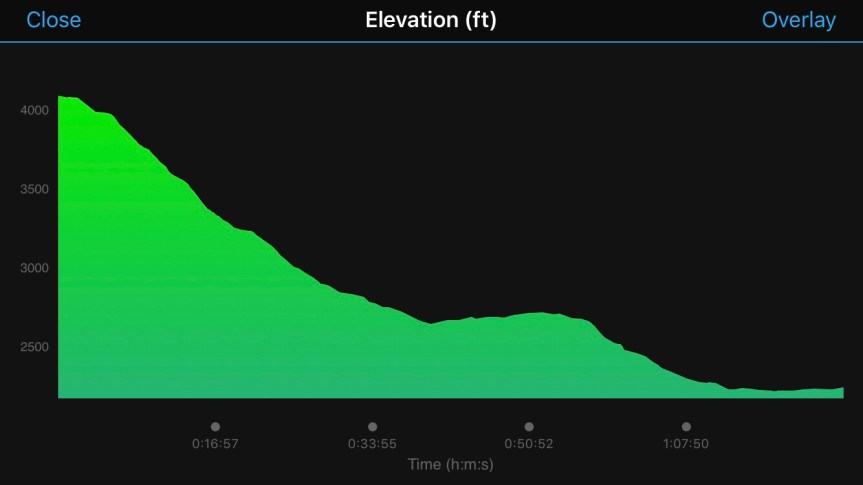 Unfortunately, I forgot to turn my Garmin on when we started (grr!), but here is the elevation map of the way down:
