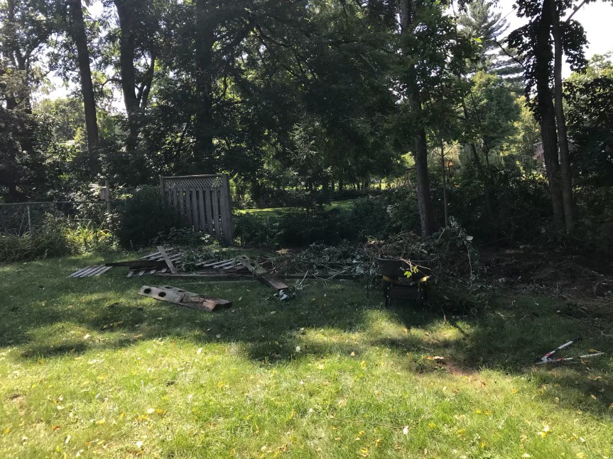 Boy, did we ever labor on Labor Day! We took out about 12 wheelbarrows worth of weeds, old cut grass and branches. I dragged countless loads of branches to the curb to be chipped, and our neighbor plans to burn some of the old fencing this fall in his firepit. I also had to dig up some plants I wanted to keep that were along the fence-line.