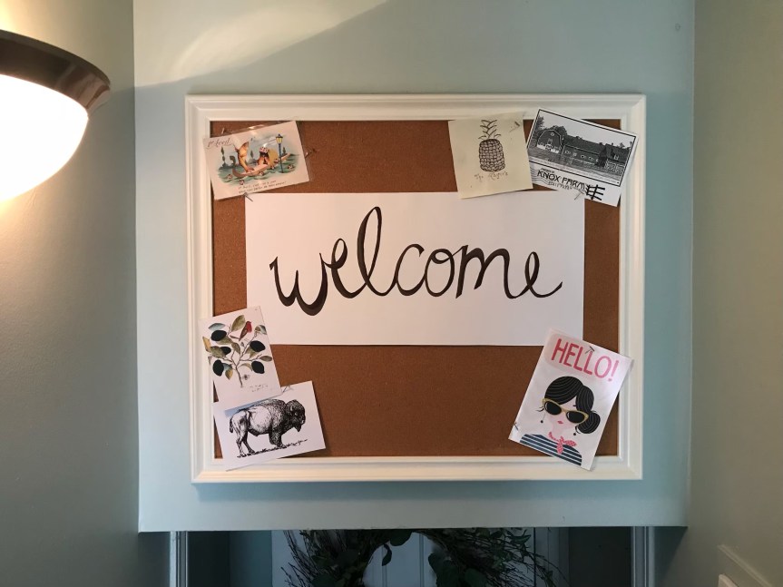 I bought heavy, textured card stock at Hobby Lobby, then painted my own sign and tacked it to the board. I added some pretty cards I’d already had on display on another cork board (there are multiple in this house), and plan to continue filling in the gaps as I find/receive appropriate cards.