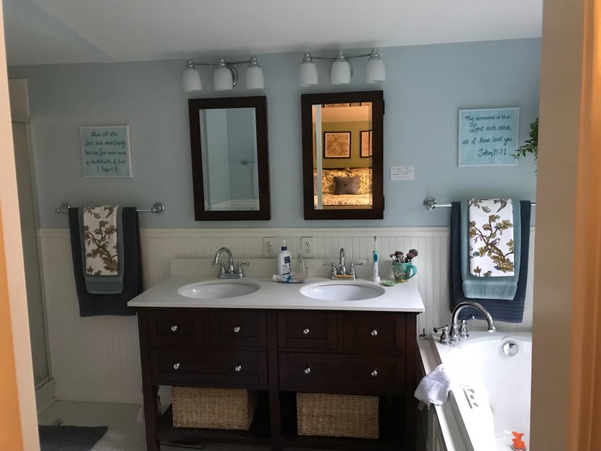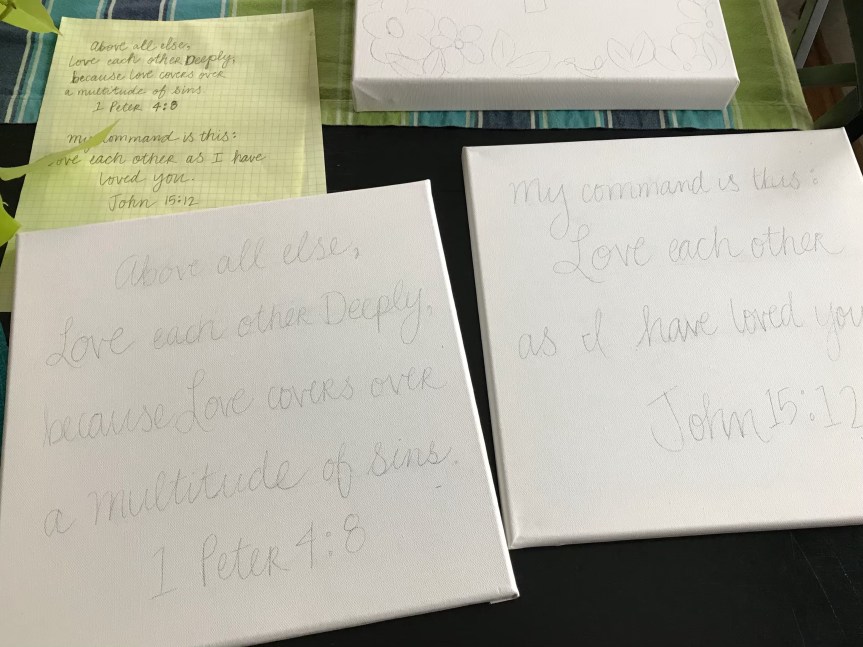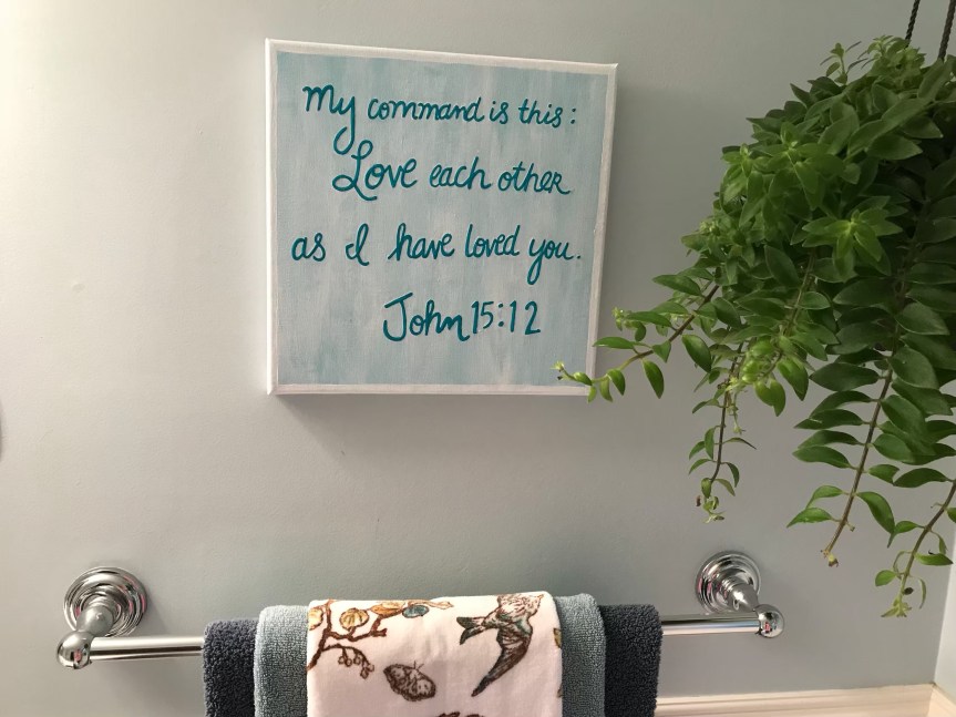 I knew I wanted two small pieces to hang over our towel racks, but didn’t want them to stand out very much from the wall. I figured verses about ‘love’ would be fun, since we’ll see them every day.