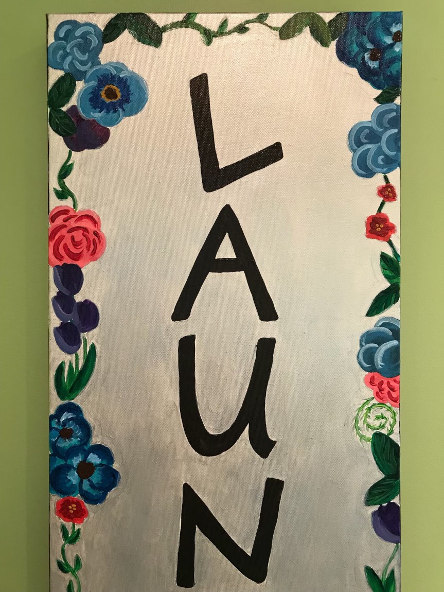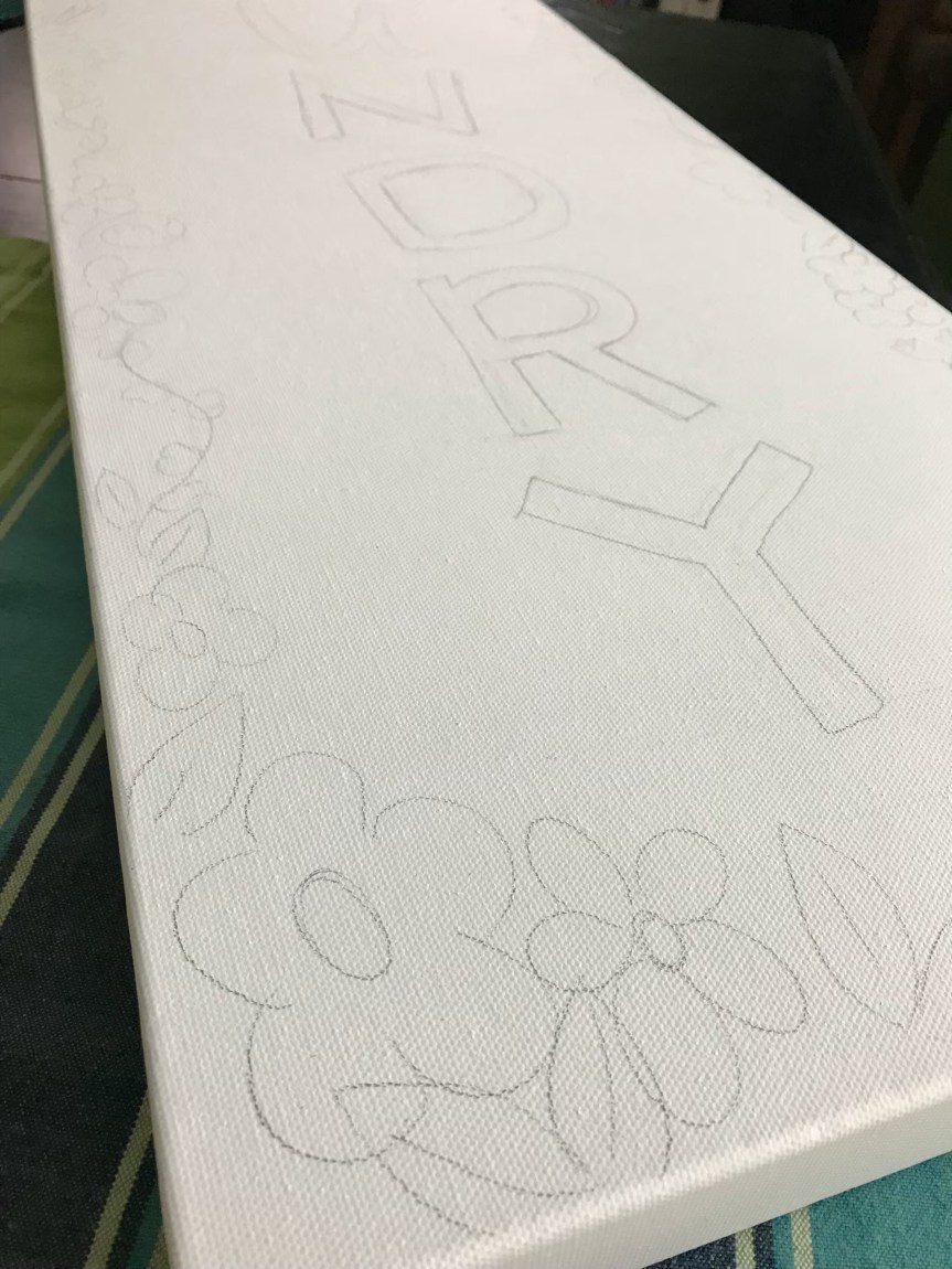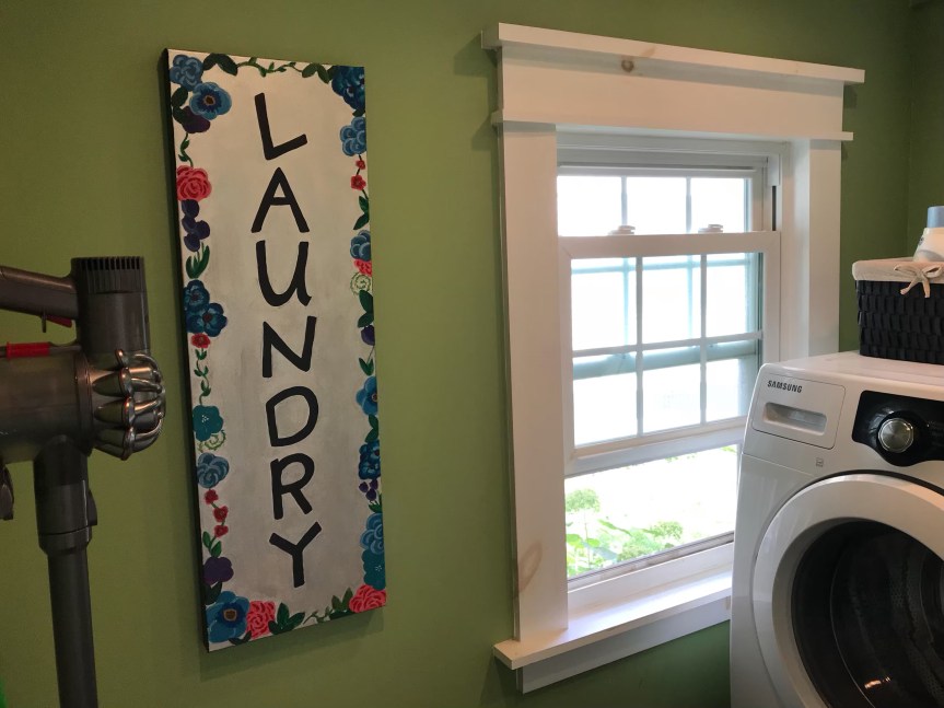 In the blog post linked above, I had already painted something for the laundry room, but wasn’t completely happy with the placement. I really wanted something that said, ‘laundry.’ Or, ‘clean,’ or something like that. I did, however, like the vertical design and thought I’d stick with that. I began sketching.