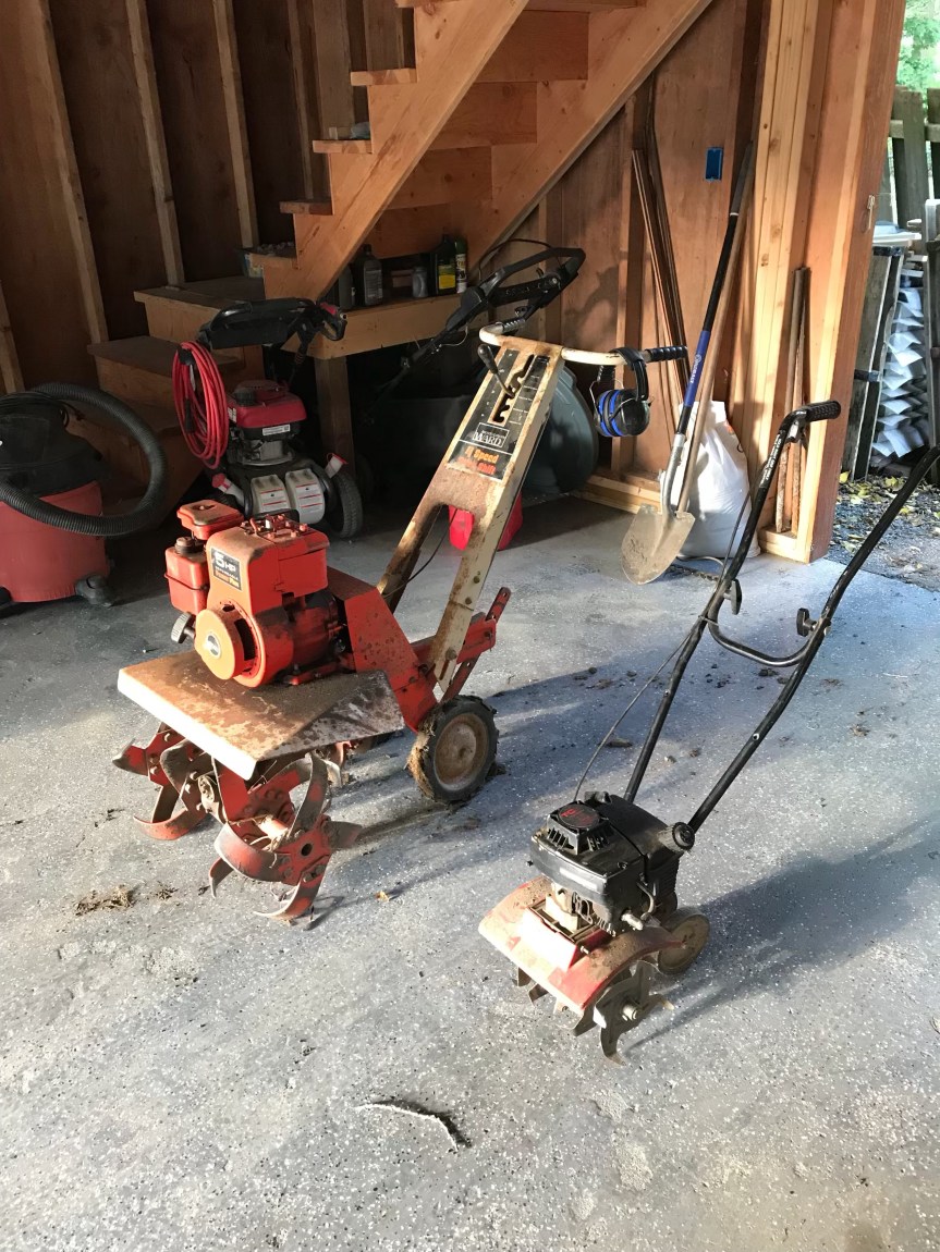 Check out the difference between our beast tiller, and my friend Dale’s ‘baby’ tiller: