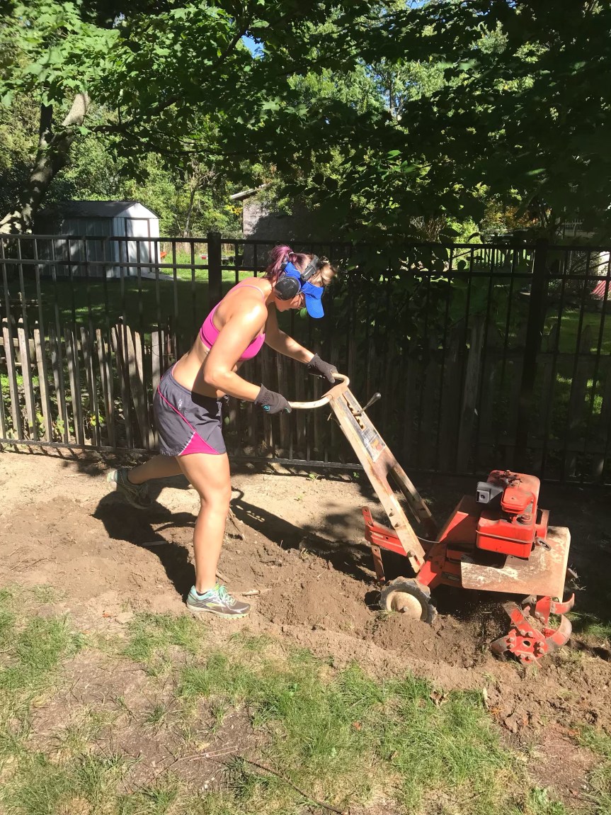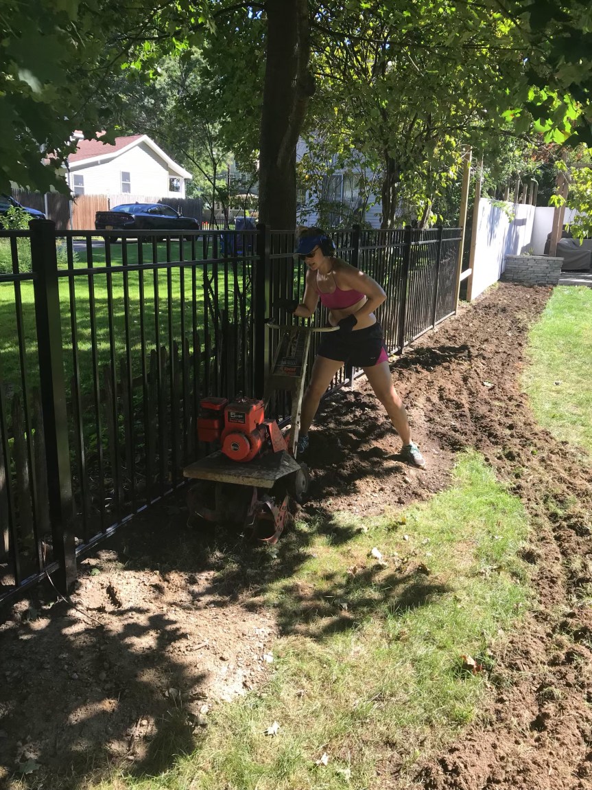 I had taken the top layer of grass off some of the areas already, so I jumped right in. Andrew got the tiller started and off I went!