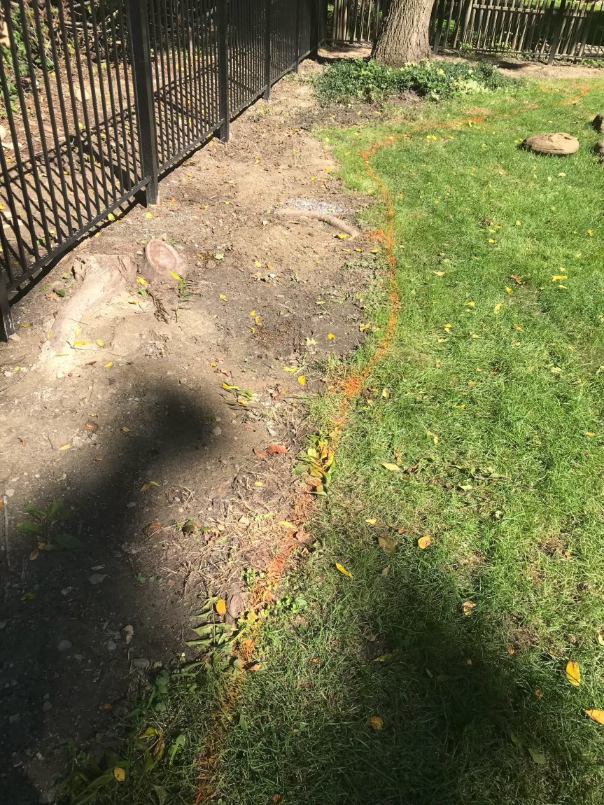 First, I used spray paint to mark my beds along the fence line. It came out pretty imperfectly, if I do say so myself. (Thankfully, I was able to make more precise lines later on with a shovel.)