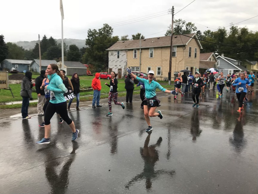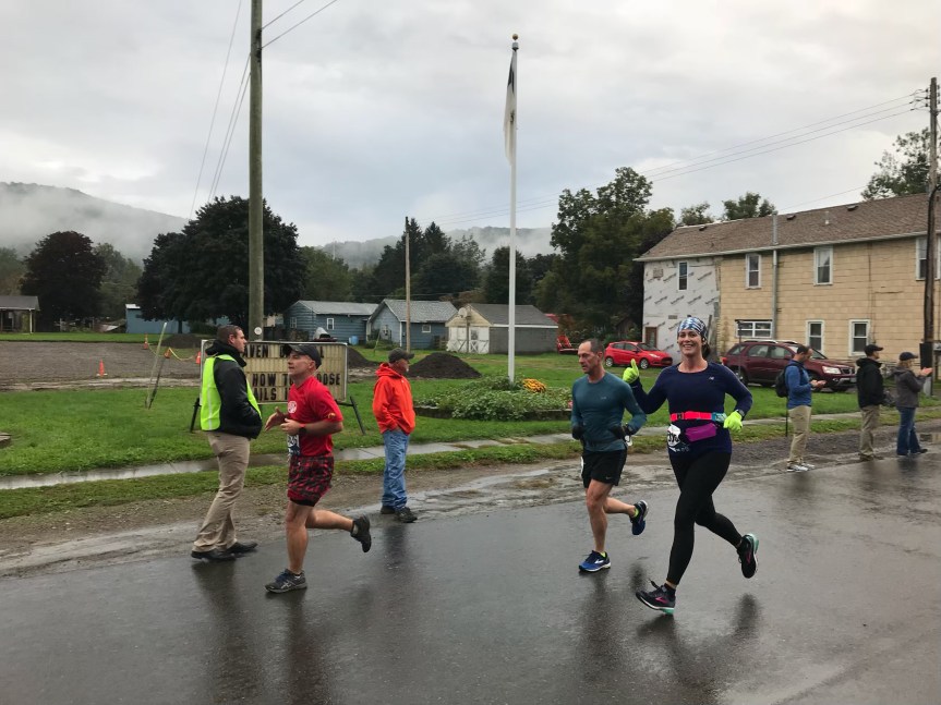 It was a rainy morning, which had not been in the forecast. I lamented leaving my raincoat and umbrella at home, but at least I had a hat! After seeing my friends, I high-tailed it back to Corning to park the car before heading to the finish line.