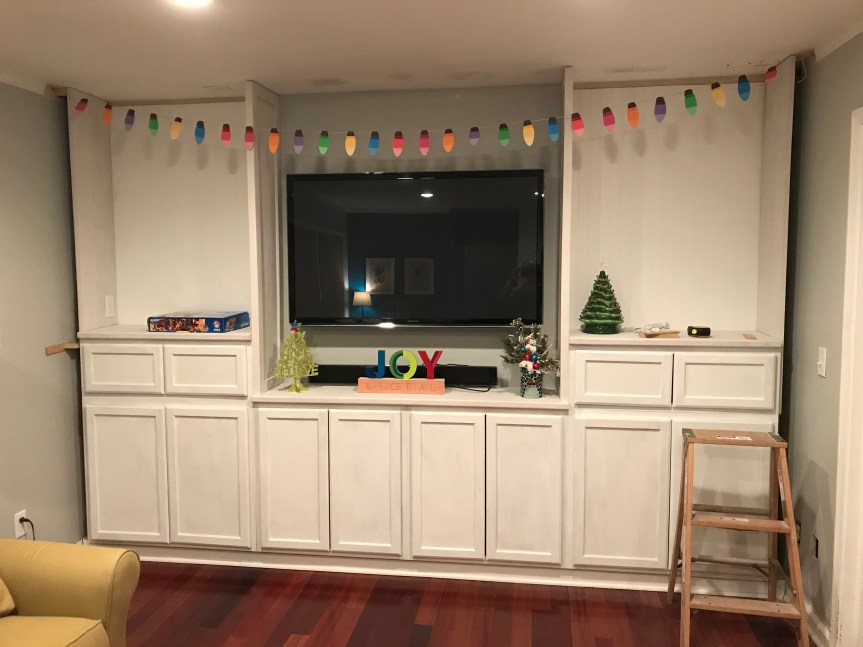 Andrew and I haven’t quite finished the built-in cabinet project that we, I mean I, started a month or so ago. It’s coming together and we’ve made great progress in the last couple weeks. Andrew busted his butt for two days before the party working on electrical and getting the sides up so we’d have something to show everyone. I threw on some decorations and called it fine.