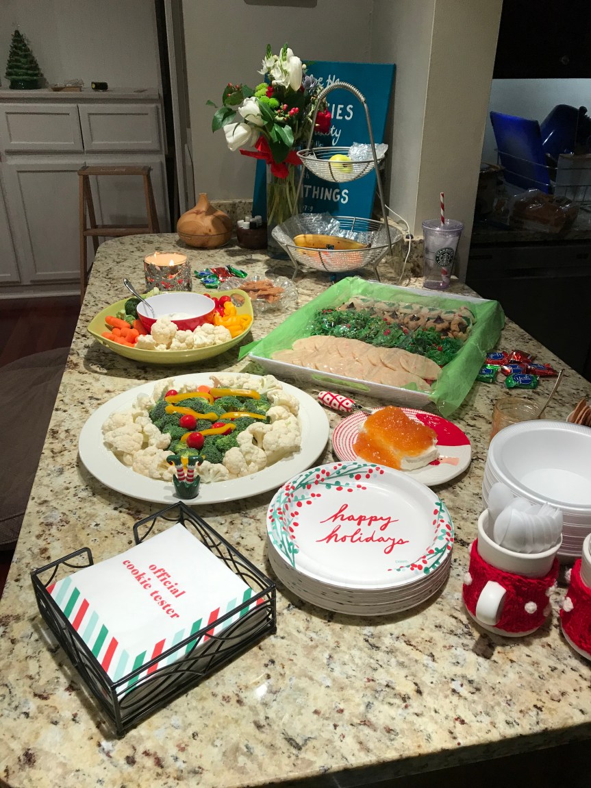 As usual, Andrew and I hosted our annual Christmas Eve party at the house. I made my usual spread of cookies (this year was a bang-up year; two from scratch and two from the store), veggie tray (note the broccoli-and-cauliflower-Christmas tree), hot pepper jelly (thanks, Mom!) and chili. And, AS USUAL, we failed to go to church, again. We had high hopes of making it to an 11 p.m. candlelight service here in the village, but we were way too pooped to leave the house after cleaning up from the party. Next year, we’re going to our own church’s afternoon Christmas Eve service if it KILLS us! We did, however, spend time reading about the birth of Jesus in Luke (a longtime family tradition of mine), exchange our new jammies, and even incorporated this Advent devotional. Next year, we plan to do it the entire month of December. (Insert fingers-crossed emoji.)