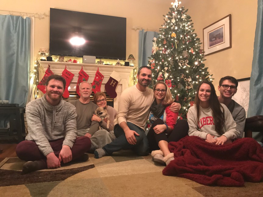 The next morning, we packed everything up and drove a mile across town to Andrew’s parents’ house. Both Andrew’s sisters and their families were there, which is always nice. Carolyn (center, below) gifted me with matching ornament leggings!