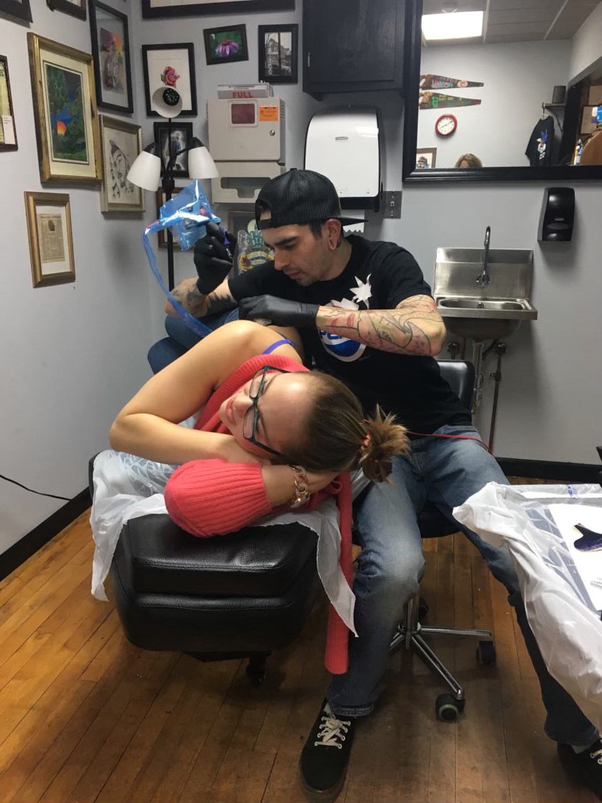 The following weekend, I was lying in the chair at EA Ink (“Where the housewives of East Aurora go to get tattoos,” according to Andrew.) with my sister-in-law, Carolyn, and friend, Stacy, for support.