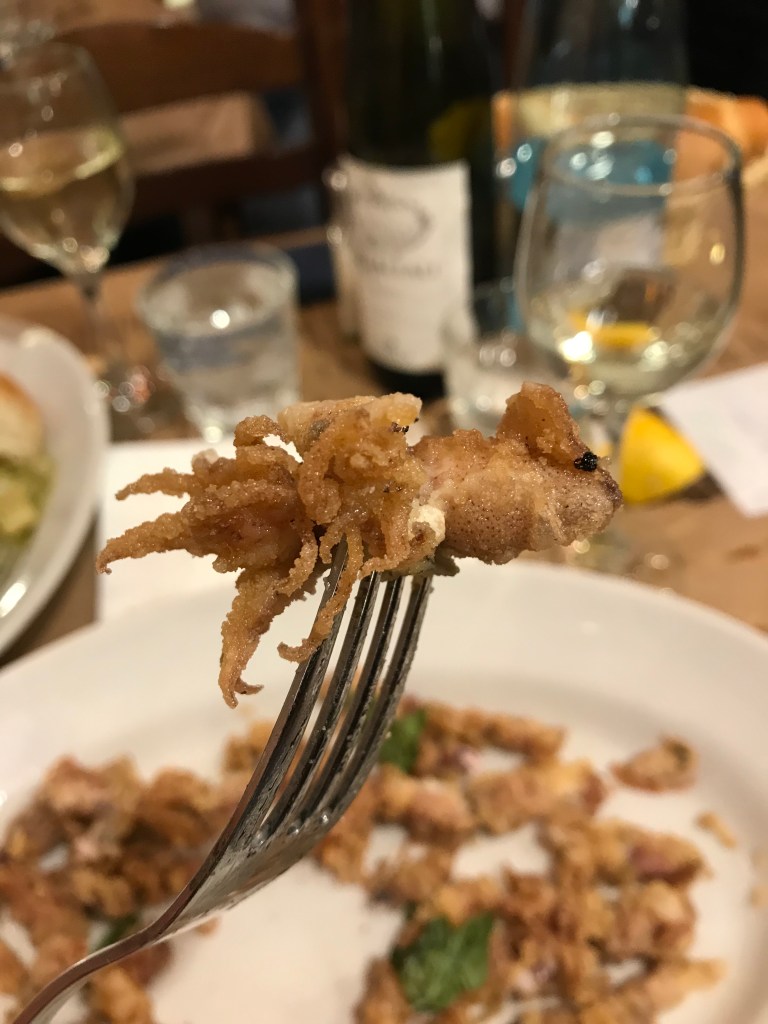 Perhaps our most fondly-remembered experience was what we began referring to as ‘priority baby.’ One evening, after striking out twice at restaurants already full for dinner, we stumbled upon Ferro di Cavallo (The Horseshoe), with a lively scene out front. Almost too lively, in that we had no idea if we’d successfully gotten on the waiting list and we feared that we’d be waiting way too long with how many people were outside. Just as we were thinking about leaving, one of the servers came out, pointed at me, and said “priority bébé” and ushered us in. We sat down, relieved we hadn’t been forgotten and surprised to be seated so quickly, and proceeded to use Google translate to decode the entirely Italian menu as quickly as possible! We both loved our calamari: