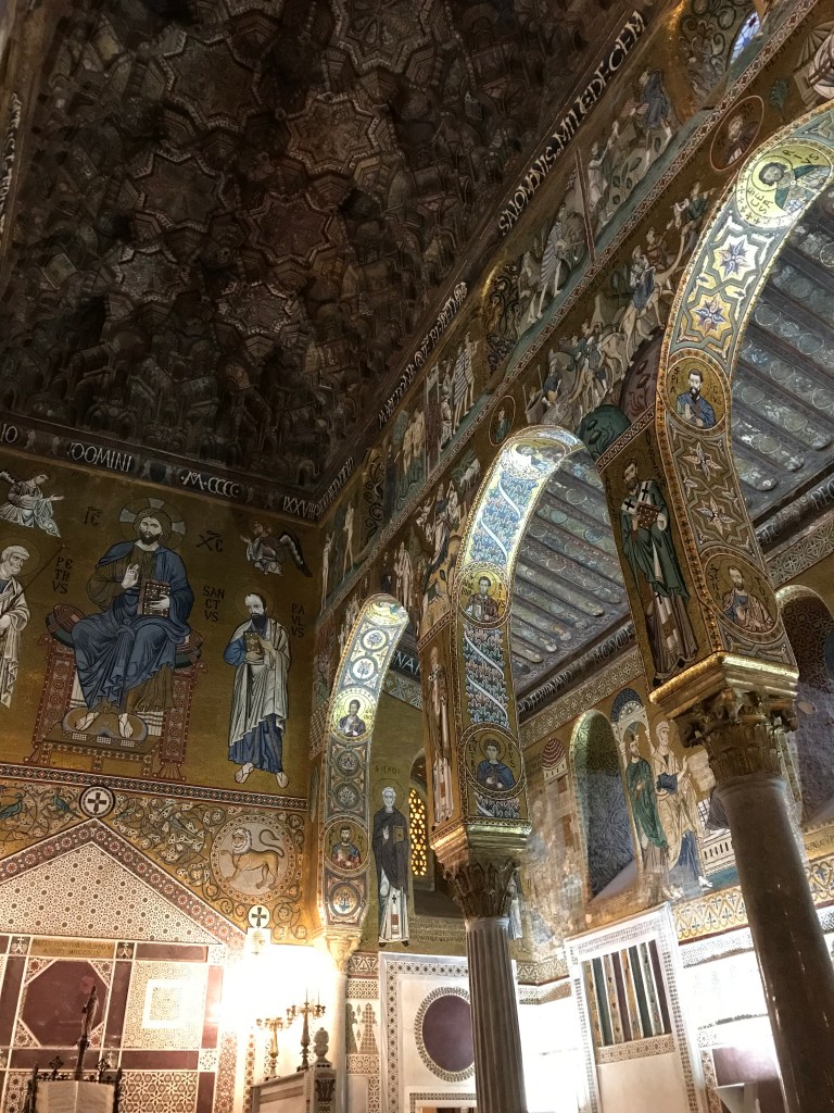 Another church highlight was Monreale Cathedral, located just outside Palermo. We visited early on a Sunday morning and had the treat–if only for five or so minutes–of having the place all to ourselves. It’s a Norman ‘church-fortress,’ which you can see from the outside. However, the inside holds another beautiful mosaic ceiling, this one featuring multiple scenes telling the story of Genesis.