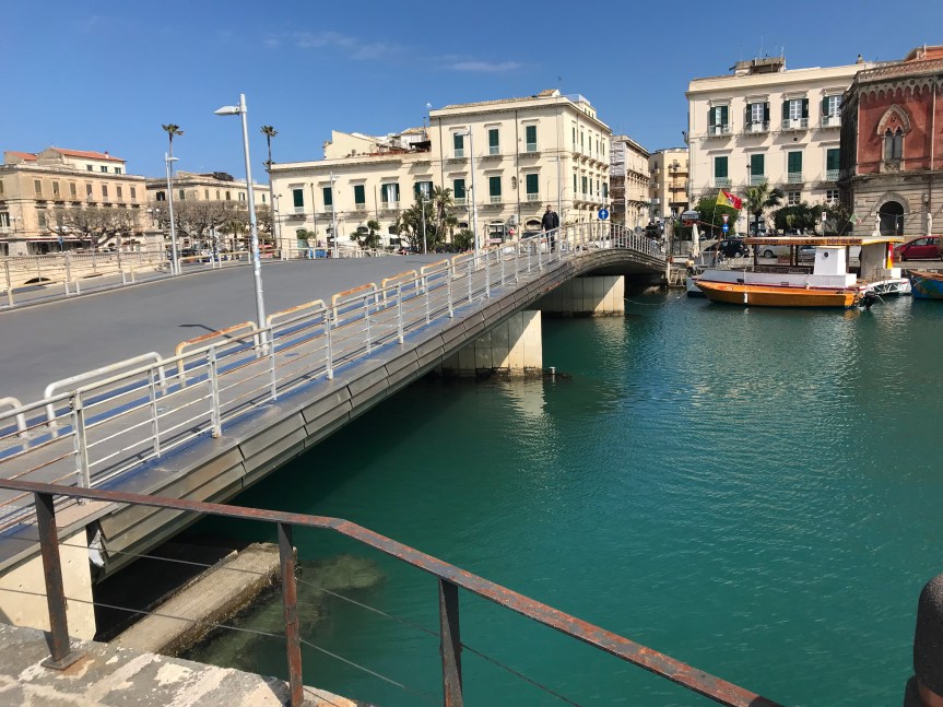 One of our favorite stops of the trip–the kind of place to which we could imagine coming back–was Ortigia, the ‘old town’ of Siracusa.  It stands to reason, as Rick calls Ortigia “the most enjoyable urban environment anywhere in Sicily.” Siracusa used to be one of the powerhouse cities in ancient Sicily, and Ortigia is a little island in the bay, connected by a couple small bridges.