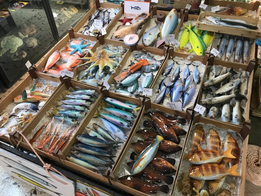 Handmade fish art at the Fish House Gallery on Via Cavour.
