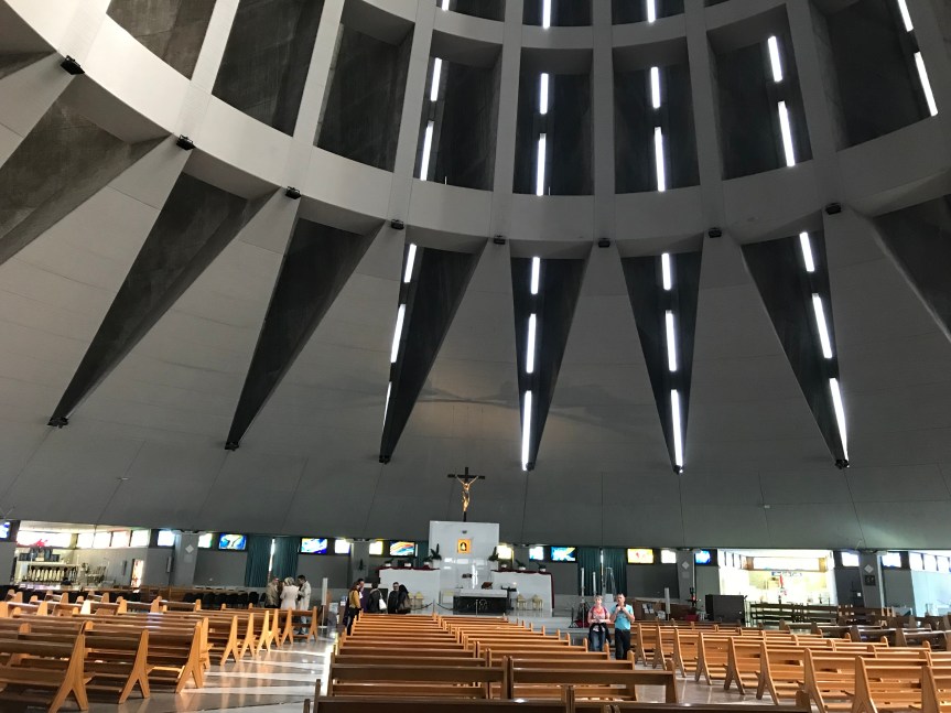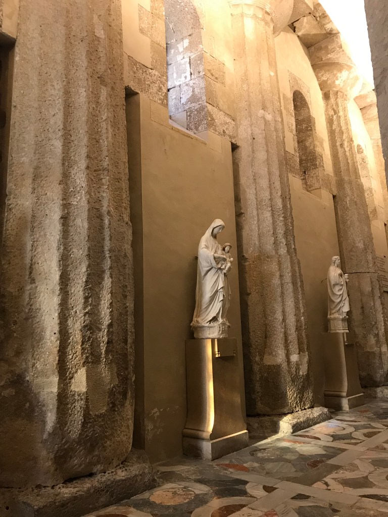 Afterward, we spent most of our time seeing the sights on mainland Siracusa. We started with the Sanctuary of the Madonna of Tears, a mid-century church built in 1953 to honor the ‘miracle’ of a weeping Virgin Mary statue. The church was certainly worth a visit, as it contained a basement ‘crypt’ with the statue in question and a room filled with ‘answered prayers’ in the form of wedding dresses and no-longer-needed prosthetics, as well as the unique, cone-shaped sanctuary on the floor above.