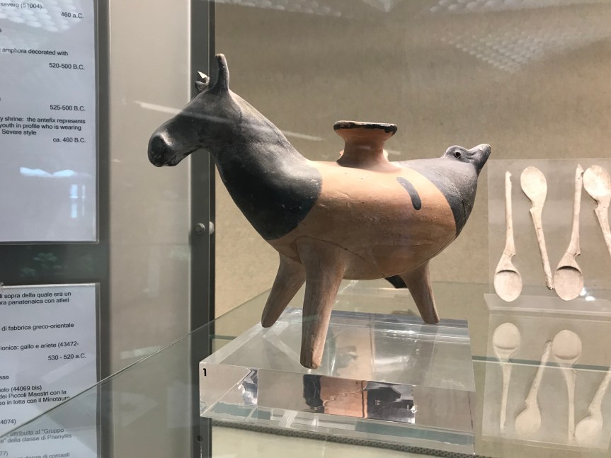 Remember that museum we went to at the Valley of the Temples? We were supposed to find a donkey-shaped baby bottle, but it wasn’t where Rick said it would be. Turns out, it’s been moved to the Paolo Orsi Archeological Museum in Siracusa!
