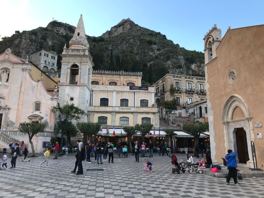 Once we were finished with the theater, we meandered the main drag and took advantage of the Piazza IX Aprile, which Rick calls Taormina’s “living room.” Tourists and locals were out in full force, with children playing ball or riding bikes, adults chatting and the surrounding cafés were full.