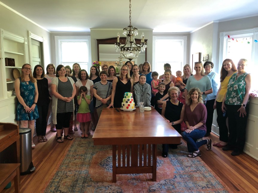 We all gathered for a group shot before Maya (pictured next to me in a gray sweatshirt, below) and I cut the cake. Attendees included local friends and family (including Abigail and baby Nora from Philly), gals from running group, a few of their kiddos, and my mom and Hannah from Virginia.