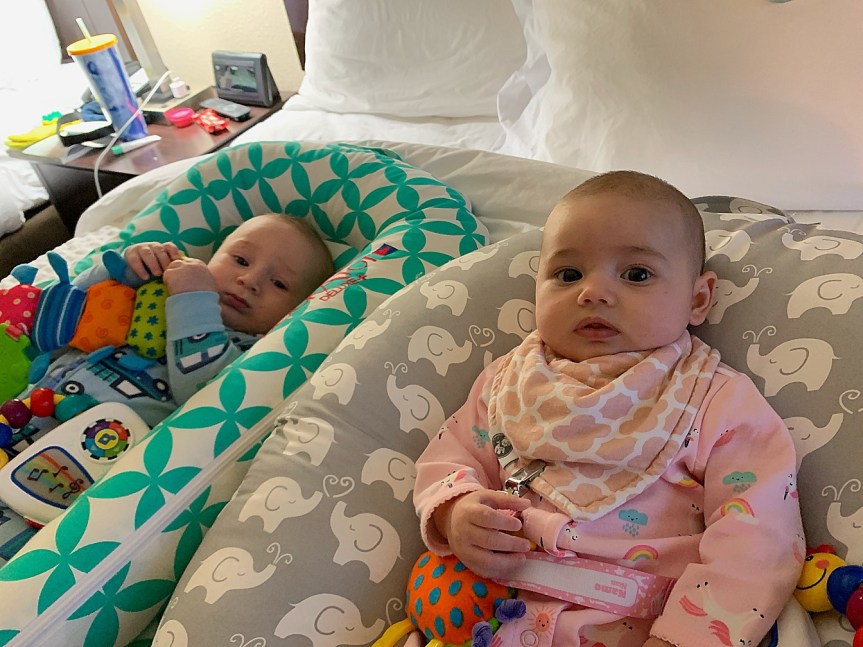 The adjoining hotel rooms were nice so we could have the babies together on a play mat or in the Dock-A-Tot (Emmett) or Boppy Lounger (Maelle) while we visited or got ready. It was Maelle’s first big car ride, night in a hotel and chance to sleep in her travel crib, and she did great. Doing this trip made us excited for the trip to Florida our families are taking together in January!