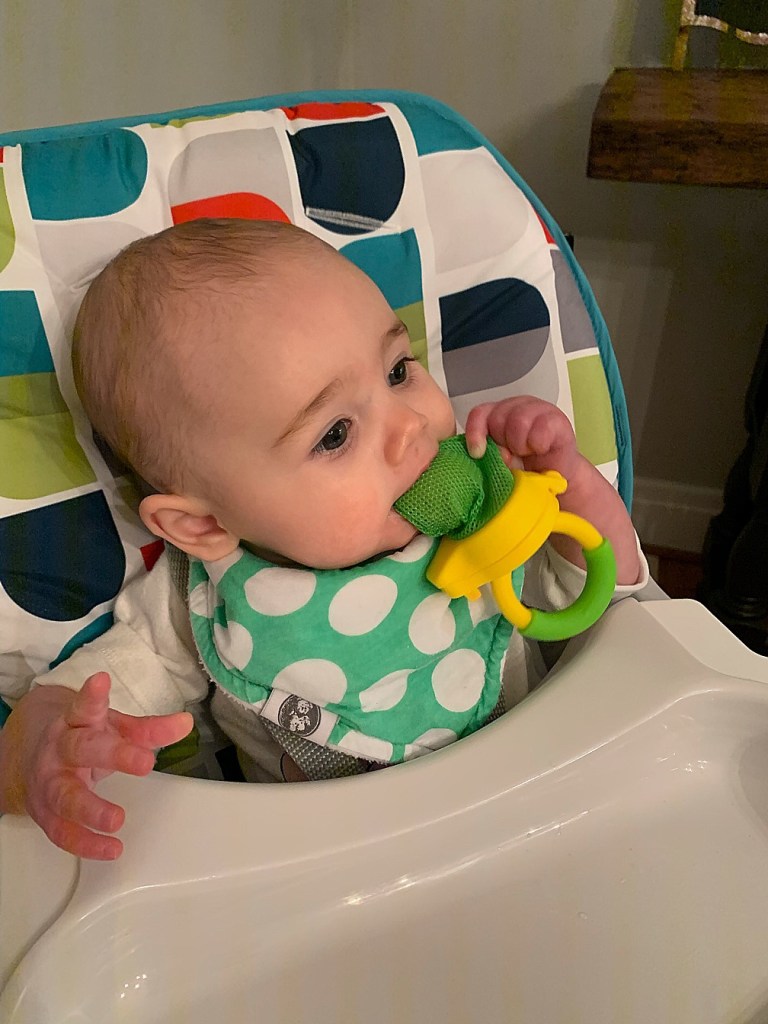 In addition to Bambas, we’ve given her raw carrots and celery to gum, and some cooked carrots and potatoes. She did have a gagging incident last night with the cooked veggies, so they’ll stay in the mesh teether (pictured below) for a little while longer I think. I do plan to incorporate more table food/finger foods as she gets closer to six months and she has more control over what’s in her mouth.