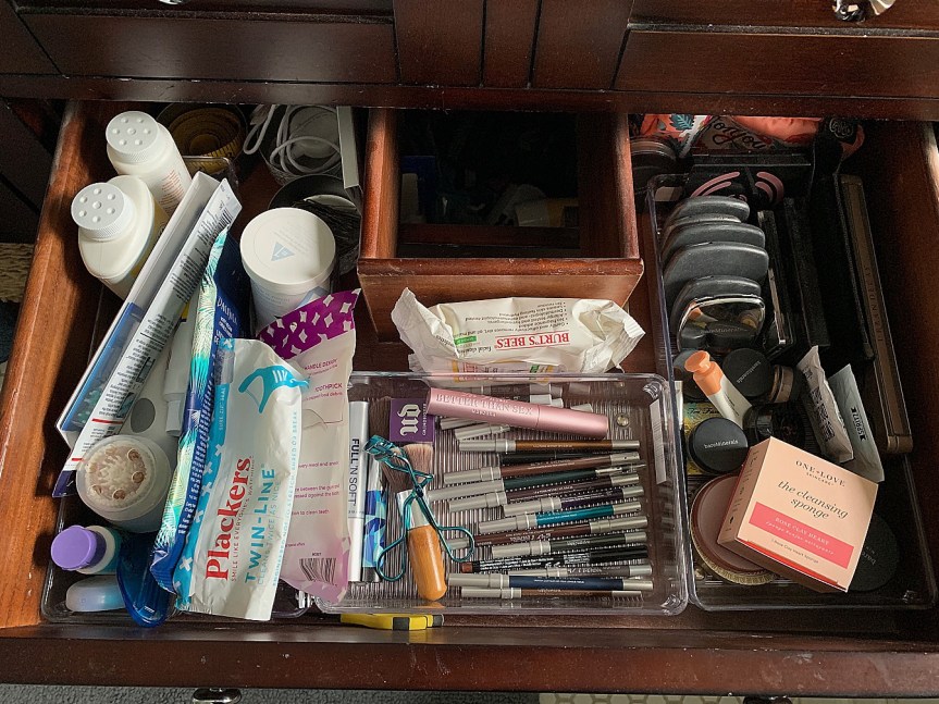 One of the reasons this project took longer than others is that I combined my organization efforts with a ‘greening’ of my products. While I haven’t spent hours upon hours researching all the ingredients in my skincare and makeup, others have and I trust their data. When my best friend was pregnant with her first daughter, about five years ago, she introduced me to cleaner products, making your own soap and the Environmental Working Group’s website and app. I wasn’t ready to go all-or-nothing–or make my own soap–at the time, but I did start switching some of my skincare to fragrance-free versions, and made a few tweaks here and there.