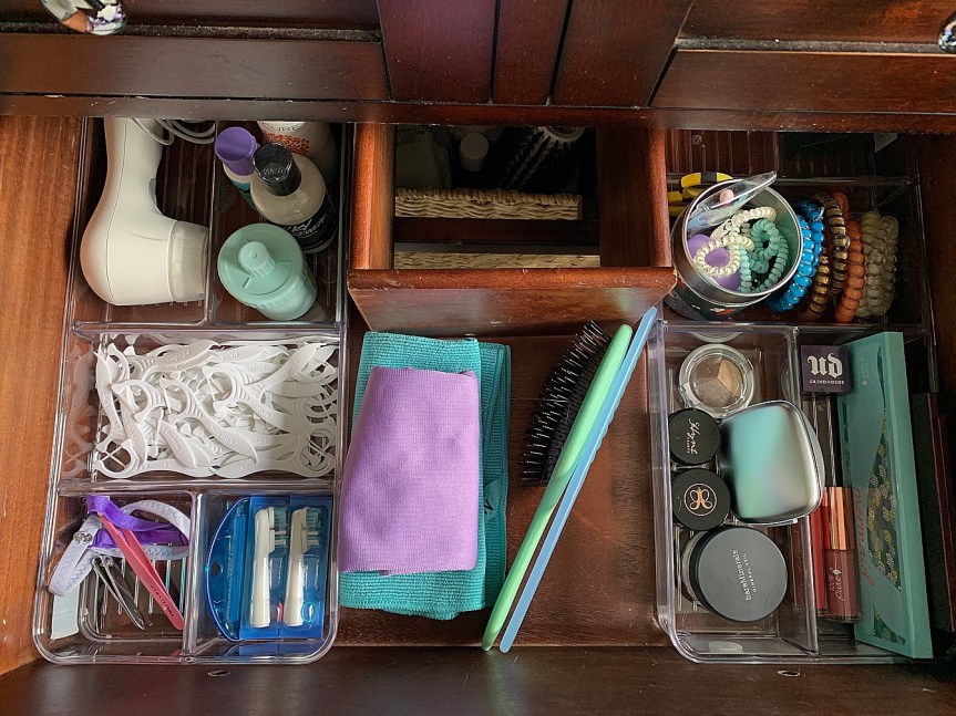 I keep my makeup in my drawer (lower right tray), and it feels so good to simplify my routine! I still can’t believe I threw away so much makeup, but when you think about all the chemicals in them that aren’t good for us, it was easier than I thought it would be. Plus, some of it was SO OLD and I rarely used most of it. No one needs eyeliner in EVERY COLOR.