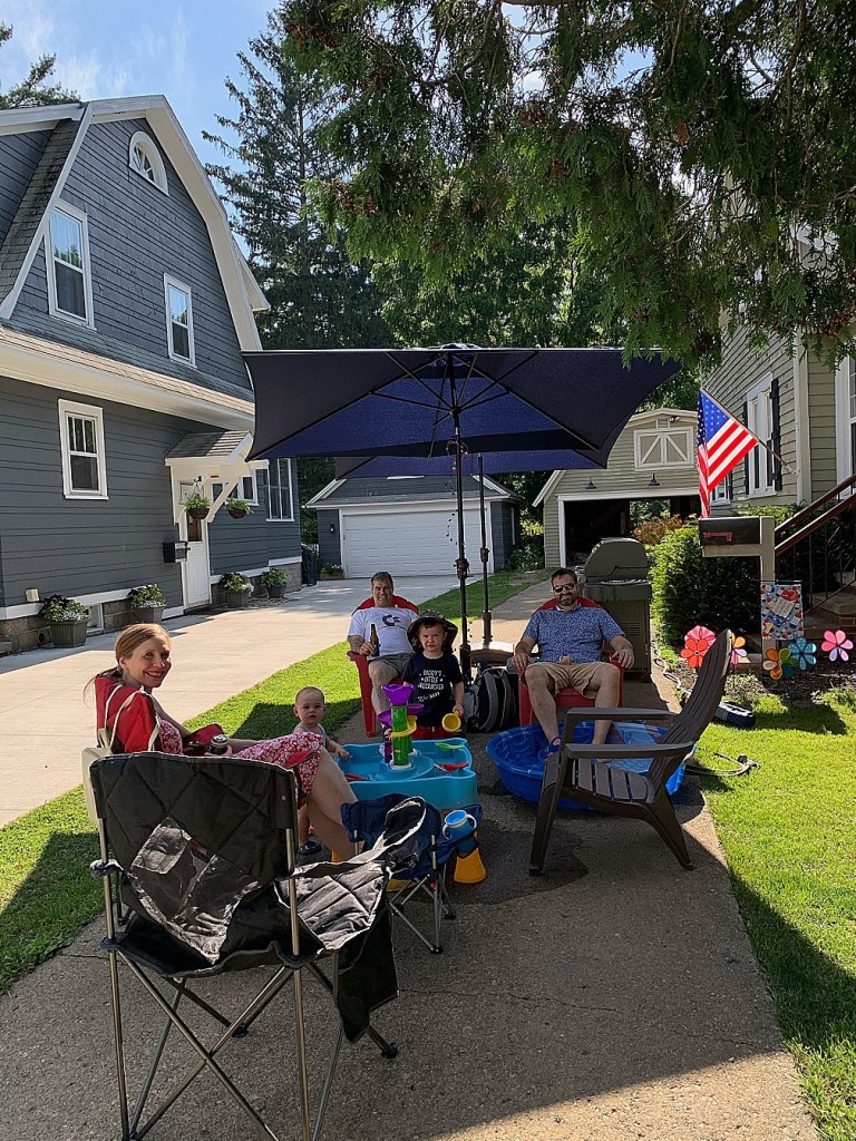Our new patio umbrellas and bases arrived just in time, so we set up a cozy spot on the driveway for the water table, chairs and the grill. I had ordered red cloth table covers for Maelle’s upcoming birthday party, so I grabbed those to do double-duty on our folding tables. We may not have been celebrating the 4th the way we normally do, but I was going to have my decorations out!