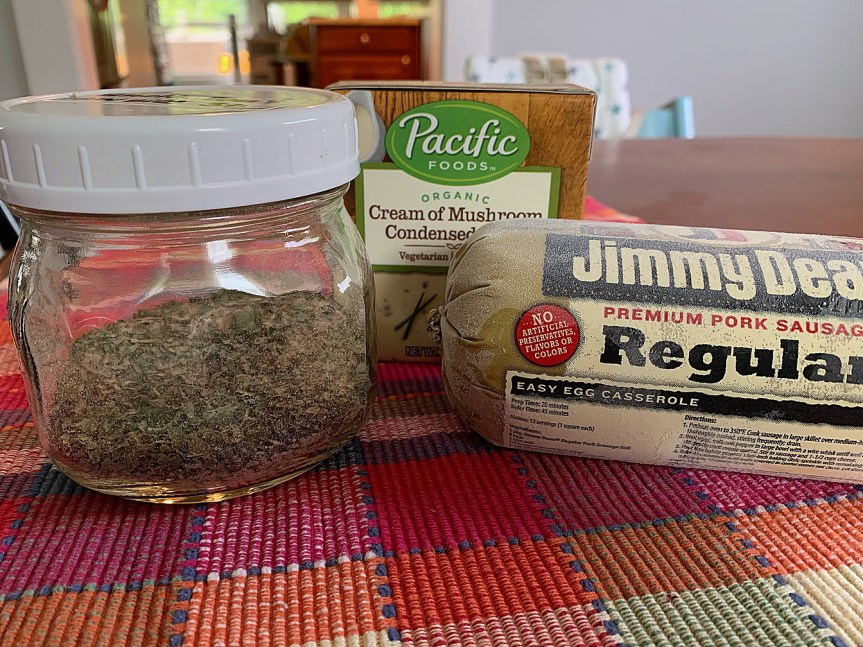 My ultimate goal here is ease of preparation, and that includes purchasing those ingredients. Unfortunately, the co-op’s ground pork is $$$, so I continue to pick up two or three tubes of Jimmy Dean sausage each time I’m at Tops. The co-op DOES carry a different brand of cream of mushroom soup, and I’m pretty sure attempting to make it from scratch for this recipe takes the ‘ease’ out of the preparation.