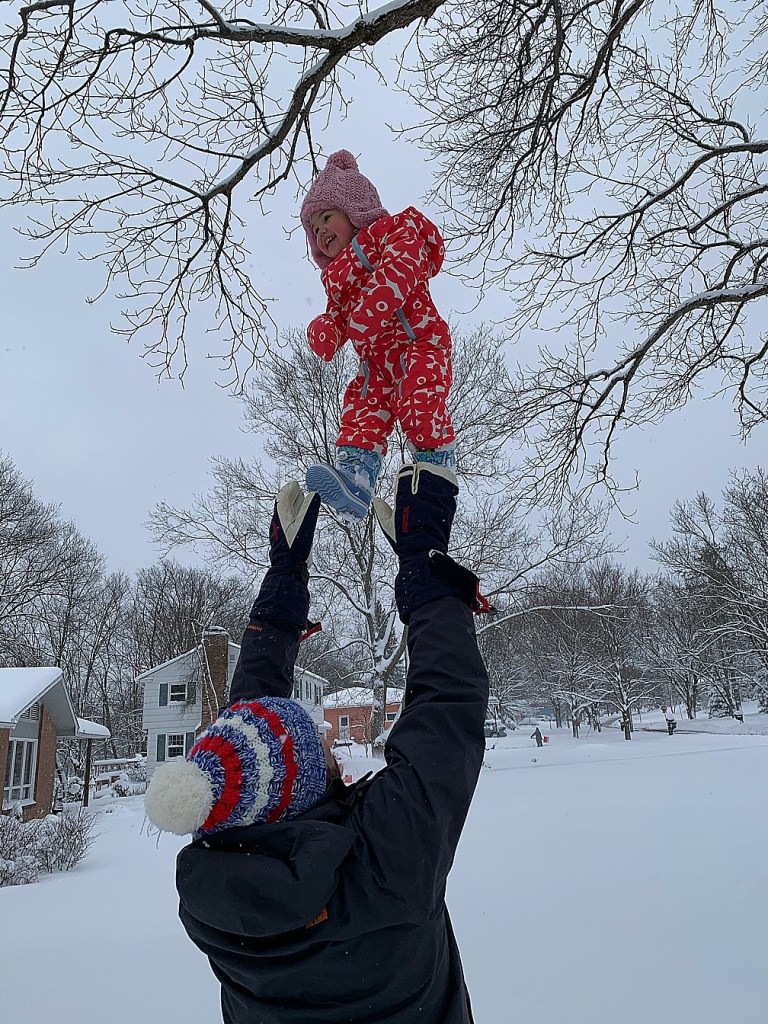 Maelle loves the snow, her daddy, and to being tossed up in the air! We did some sledding and playing with her cousins before coming inside to dry off and warm up.