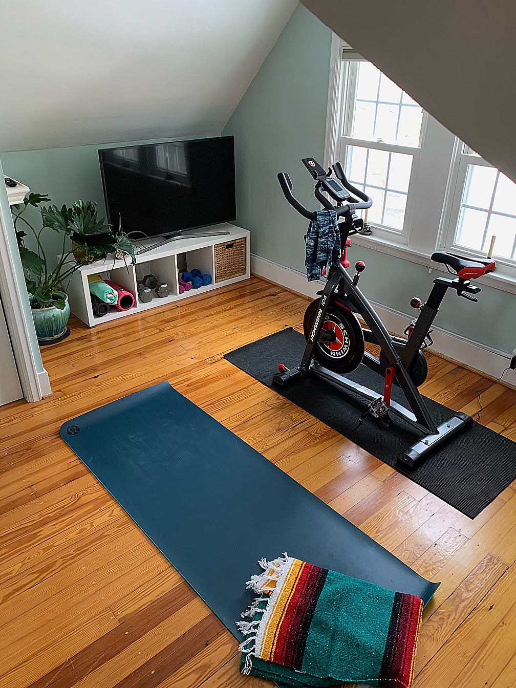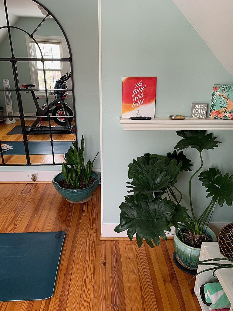The room makes a great home for some of my plants, which have been shuffled from room to room to keep them safe from Maelle once she started crawling. I put some ‘inspirational’ items on the wall shelf, and I love the pop of color they add and that I can see them while I’m on the bike.