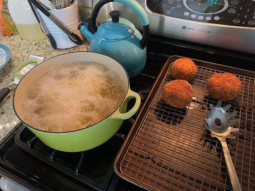 After forming a hole in the risotto balls and filling it with a little ragú, we sealed them up with a bit more risotto, rolled them in breadcrumbs and started deep-frying.