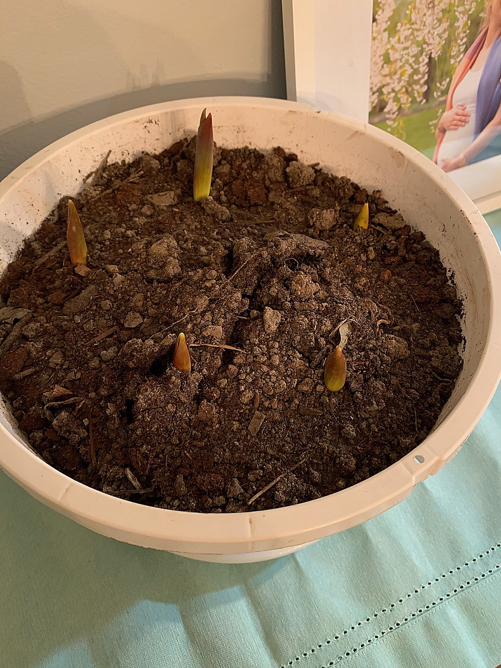 But first! My friend, Wendy, gifted me a pot of bulbs Friday, and just one tiny shoot was visible at the time. Look how much our tulip bulbs have grown in just about 36 hours! Below is a photo taken Saturday morning